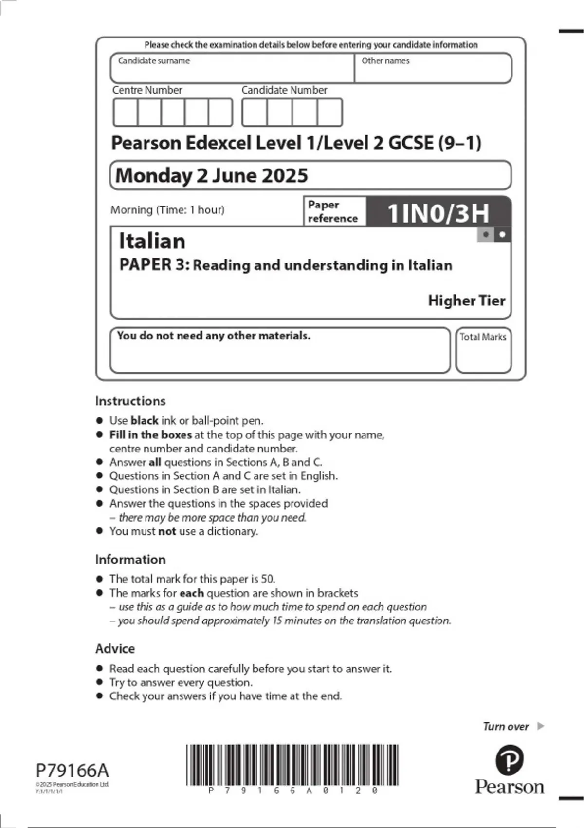 2025 Pearson Edexcel Level 1/Level 2 GCSE 1IN0/3H Italian PAPER 3: Reading and understanding in Italian Higher Tier