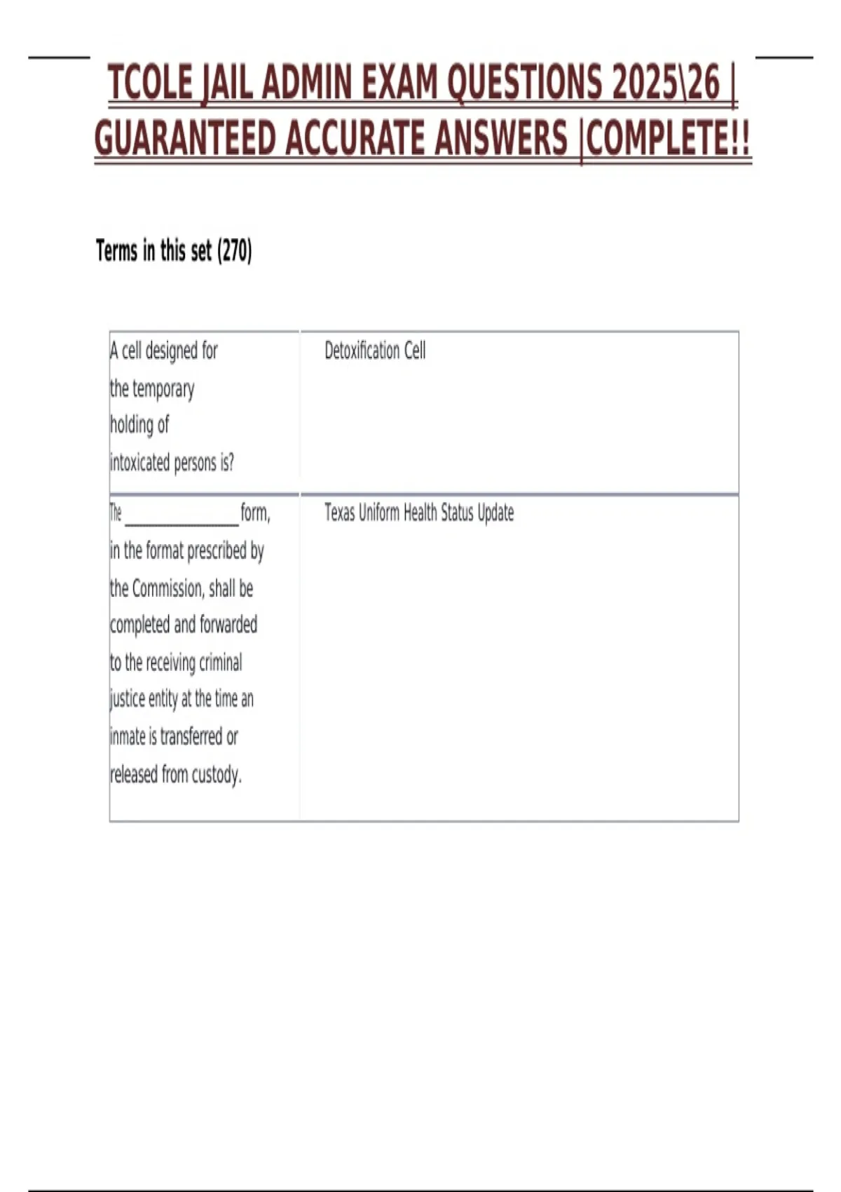 TCOLE JAIL ADMIN EXAM QUESTIONS 202526 |GUARANTEED ACCURATE ANSWERS |COMPLETE!! TCOLE JAIL ADMIN EXAM QUESTIONS 202526 |GUARANTEED ACCURATE ANSWERS |COMPLETE!! TCOLE JAIL ADMIN EXAM QUESTIONS 202526 |GUARANTEED ACCURATE ANSWERS |COMPLETE!!
