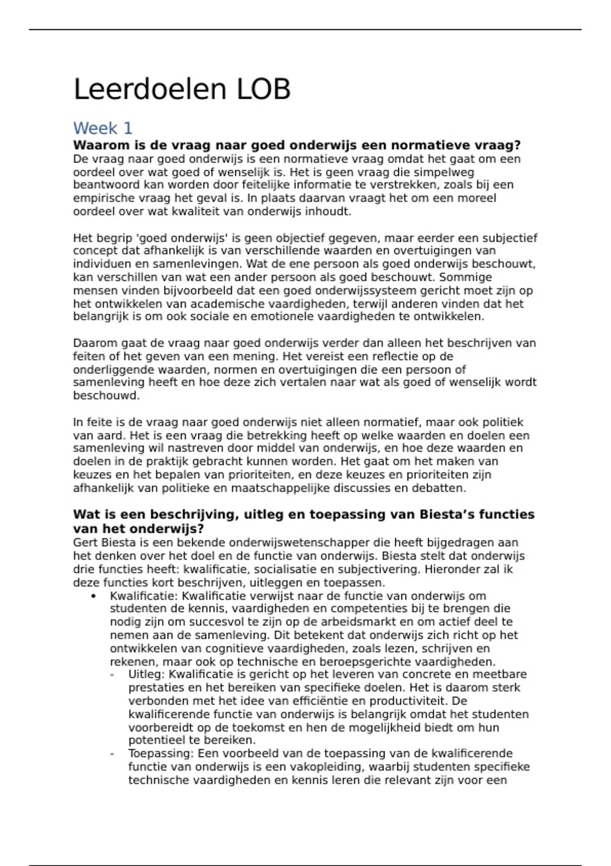 Dit is een samenvatting voor het vak LOB voor zowel deeltentamen A als B. Dit document bevat een volledig uitgebreide uitwerken van alle leerdoelen per week, de literatuur per week en dus alles wat je nodig hebt voor het tentamen om net als ik een 7,5 voor het tentamen te halen!
