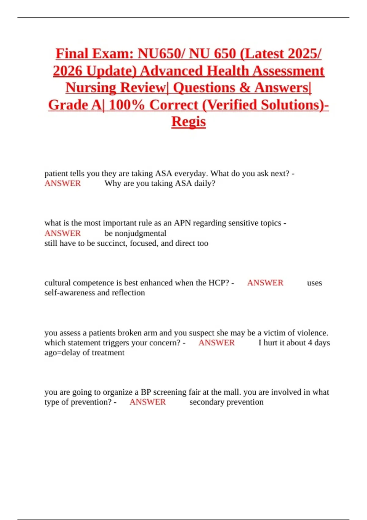 Final Exam: NU650/ NU 650 (Latest 2025/ 2026 Update) Advanced Health Assessment Nursing Review| Questions & Answers| Grade A| 100% Correct (Verified Solutions)- Regis