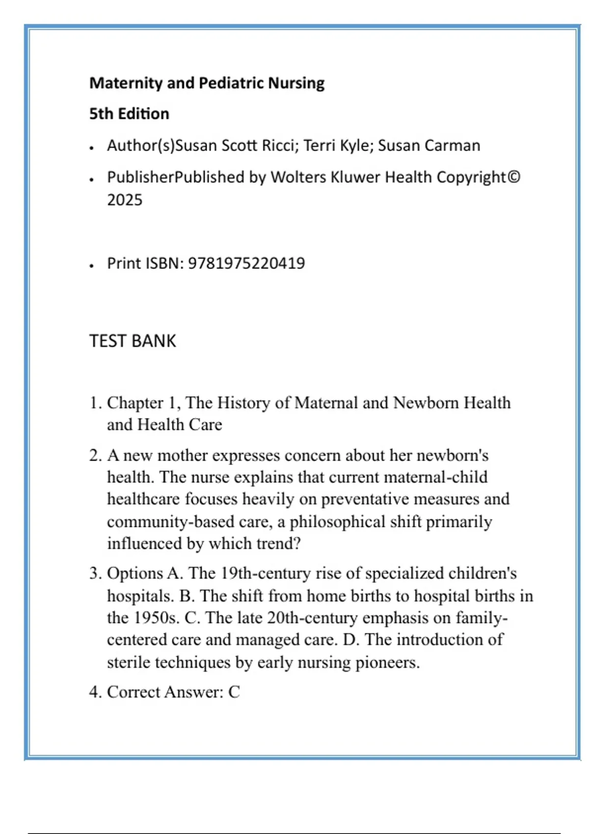 Test Bank: Maternity and Pediatric Nursing, 5th Edition (Ricci) | Verified Answers & Rationales (128 chars) Variation 2: Maternity and Pediatric Nursing, 5th Edition Test Bank | Ricci, Kyle, Carman | Verified Answers & Rationales (148 chars) 2. Description Master Maternity & Peds Nursing: Your Complete Ricci 5th Edition Test Bank Are you ready to transform your study time and secure top grades in your Maternity and Pediatric Nursing course? This is the definitive, high-converting test bank designed specifically to align with the Maternity and Pediatric Nursing, 5th Edition textbook by Ricci, Kyle, and Carman. Stop guessing and start mastering! This comprehensive resource covers all chapters of the textbook, ensuring you don't miss any critical content. Each chapter includes 20 carefully crafted Multiple-Choice Questions (MCQs), totaling hundreds of practice questions that mirror the style and difficulty of your course exams and major certification tests. What sets this test bank apart is the unparalleled study support: Every single question comes with step-by-step, verified rationales alongside the correct answer. This isn't just a list of answers—it's a guided learning tool that explains why the answer is correct and reinforces the core concepts. Perfect for students prepping for quizzes, midterms, finals, or the NCLEX-RN/PN certification exams. Invest in guaranteed study support that boosts your confidence, pinpoints your knowledge gaps, and ensures exam success. Purchase today and experience the proven way to ace your nursing exams! 3. Keywords Maternity and Pediatric Nursing Test Bank Ricci Kyle Carman 5th Edition Nursing Exam Prep Questions NCLEX Review Test Bank Pediatric Nursing Study Guide Maternity Nursing MCQs Ricci 5th Edition Rationales Verified Nursing Test Bank 4. Hashtags #NursingStudent #NCLEX #TestBank #NursingSchool #MaternityNursing #PediatricNursing #ExamPrep #Ricci5e #StudyGuide #NursingEducator
