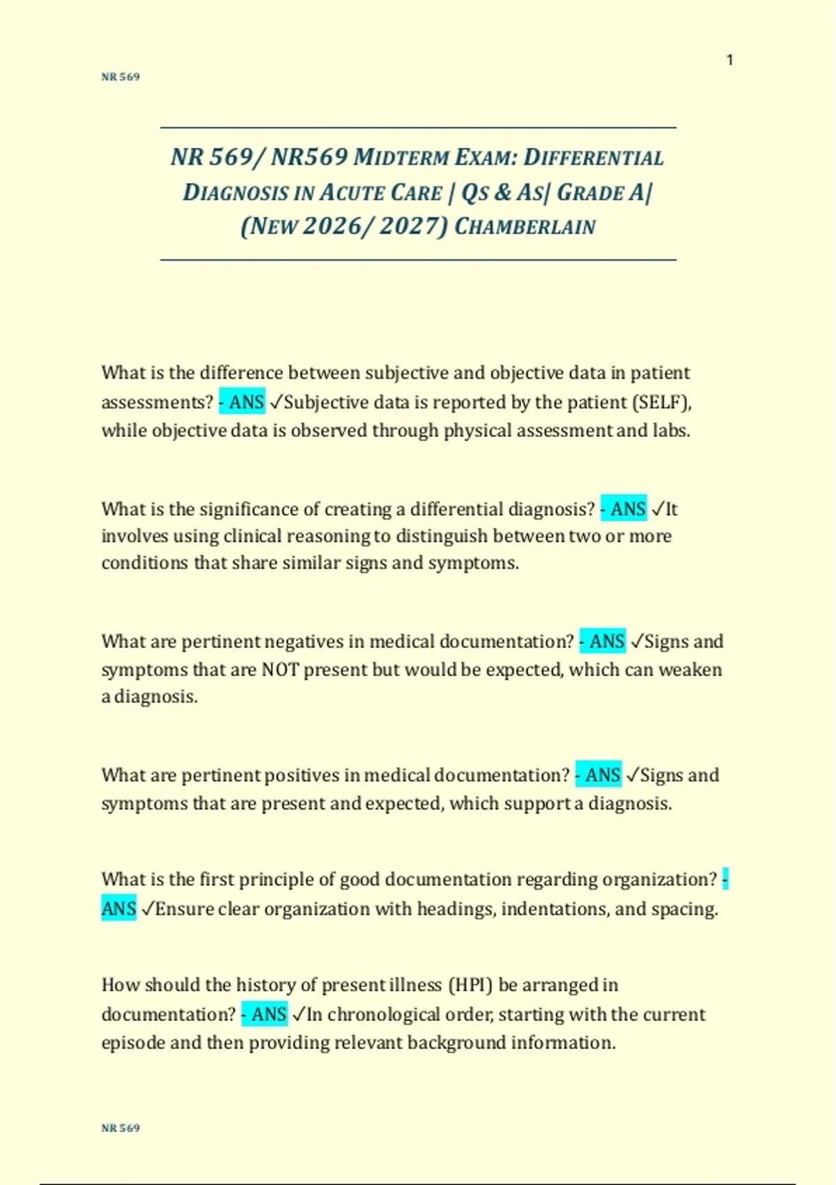 NR 569/ NR569 MIDTERM EXAM: DIFFERENTIAL