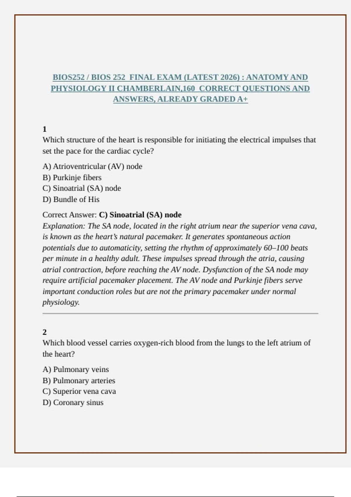 Prepare with confidence using the updated 2026 BIOS252 Anatomy and Physiology II with Lab study guide from Chamberlain University. This comprehensive resource covers detailed questions and answers designed to reinforce key concepts in cardiovascular, respiratory, renal, digestive, endocrine, and nervous system physiology. Each Q&A is explained in depth to strengthen understanding for lab and lecture exams. Perfect for students seeking reliable practice, this guide reviews organ systems, cellular processes, and clinical applications. With accurate, up-to-date explanations, the BIOS252 study guide ensures mastery of anatomy and physiology concepts for academic success and professional readiness.