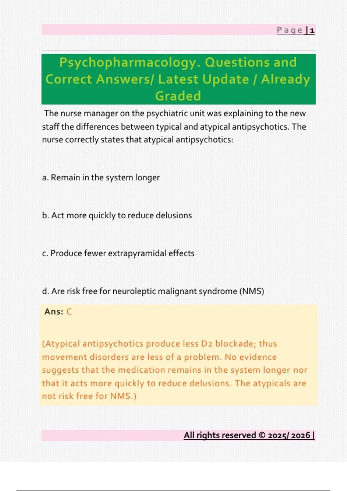 Psychopharmacology. Questions and Correct Answers/ Latest Update / Already Graded