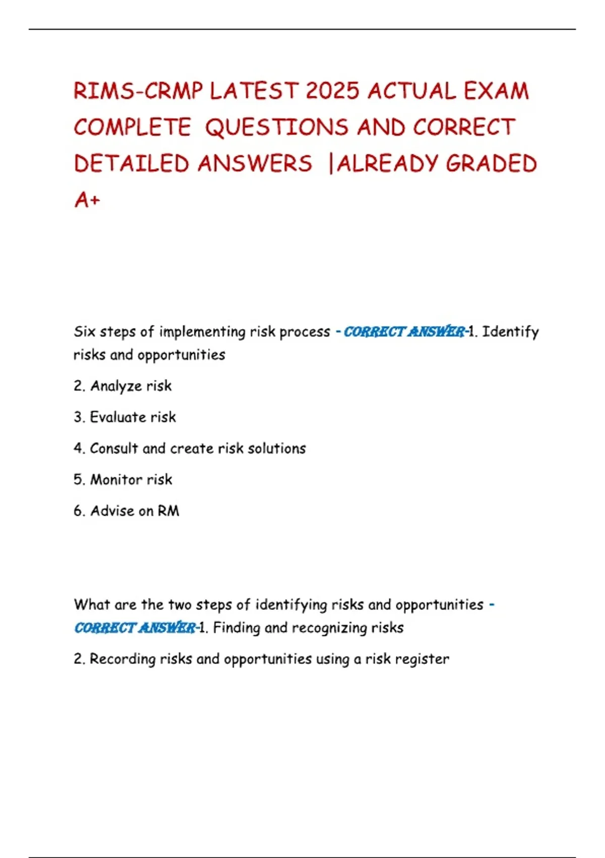 RIMS-CRMP 2025 Latest Actual Exam Complete Questions with Correct Detailed Answers Already Graded A+.RIMS-CRMP 2025 Latest Actual Exam Complete Questions with Correct Detailed Answers Already Graded A+.RIMS-CRMP 2025 Latest Actual Exam Complete Questions with Correct Detailed Answers Already Graded A+.RIMS-CRMP 2025 Latest Actual Exam Complete Questions with Correct Detailed Answers Already Graded A+.RIMS-CRMP 2025 Latest Actual Exam Complete Questions with Correct Detailed Answers Already Graded A+.