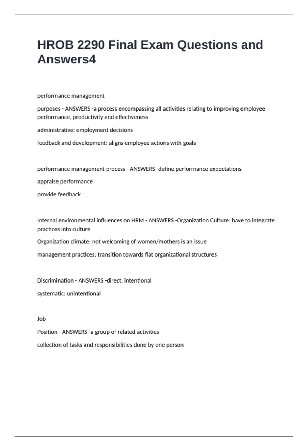 HROB 2290 Final Exam Questions and Answers performance management purposes - ANSWERS -a process encompassing all activities relating to improving employee performance, productivity and effectiveness administrative: employment decisions feedback and development: aligns employee actions with goals performance management process - ANSWERS -define performance expectations appraise performance provide feedback Internal environmental influences on HRM - ANSWERS -Organization Culture: have to integrate practices into culture Organization climate: not welcoming of women/mothers is an issue management practices: transition towards flat organizational structures Discrimination - ANSWERS -direct: intentional systematic: unintentional Job Position - ANSWERS -a group of related activities collection of tasks and responsibilities done by one person
