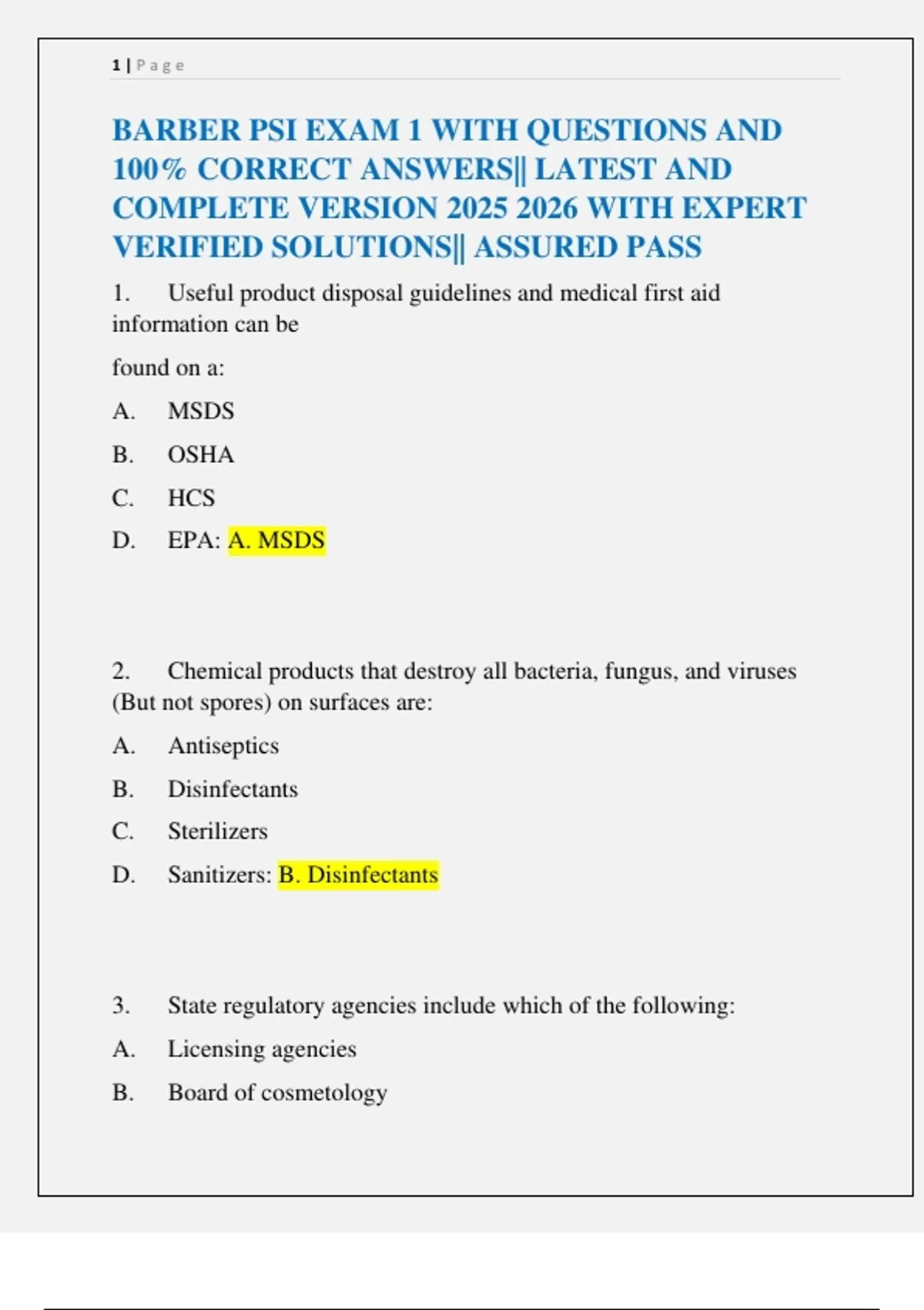 BARBER PSI EXAM 1 WITH QUESTIONS AND 100% CORRECT ANSWERS|| LATEST AND COMPLETE VERSION WITH EXPERT VERIFIED SOLUTIONS|| ASSURED PASS