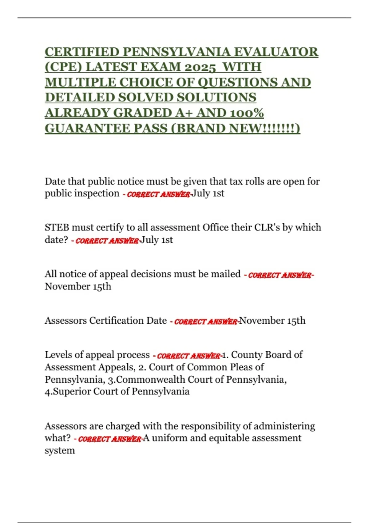 CERTIFIED PENNSYLVANIA EVALUATOR (CPE) LATEST EXAM 2025 WITH MULTIPLE CHOICE OF QUESTIONS AND DETAILED SOLVED SOLUTIONS ALREADY GRADED A+ AND 100% GUARANTEE PASS (BRAND NEW!!!!!!!)