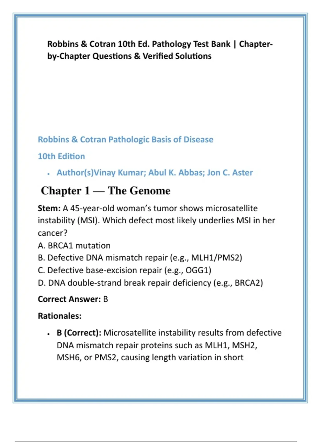 Robbins & Cotran Pathologic Basis of Disease, 10th Ed. Test Bank — Verified Answers & Rationales Description Master pathology efficiently with a complete, exam-focused test bank built from Robbins & Cotran Pathologic Basis of Disease (10th Edition). This comprehensive resource delivers full chapter coverage with 20 clinically oriented multiple-choice questions per chapter, accurate correct answers, and step-by-step verified rationales that map directly to textbook concepts. Designed for medical, nursing, physician assistant, and allied health students, each question emphasizes clinical application, error recognition, and high-yield decision-making to build deep understanding — not rote memorization. Use this collection to accelerate revision, simulate timed practice exams, and identify weak topics with trusted explanations that cite core pathology principles. The rationales are written to be exam-ready: concise, evidence-based, and formatted for rapid review. Whether preparing for school exams, licensure, or board certifications, this test bank helps you prioritize study time, improve question-taking strategies, and boost test-day confidence. Packed for digital marketplaces (Stuvia, Etsy, Teachers Pay Teachers, Amazon KDP), the resource is student-friendly, instructor-ready, and perfect for group study or flipped classroom use. Purchase includes clear organization by chapter and immediate access to all items and answers — study smarter, pinpoint gaps, and convert knowledge into high-stakes exam success. Ready to transform your pathology prep? Hashtags #PathologyReview #RobbinsCotran #MedExamPrep #NursingStudy #PathologyMCQs #ClinicalPathology #ExamPrepResources #BoardExamPractice #StudySmart #MedicalEducation Robbins Cotran 10th Edition Pathologic Basis of Disease review Kumar Abbas Aster pathology guide pathology practice questions medical exam preparation resource nursing certification study aid pathology question bank (20 per chapter) stepwise rationales and explanations clinical-pathology MCQs exam-focused pathology review