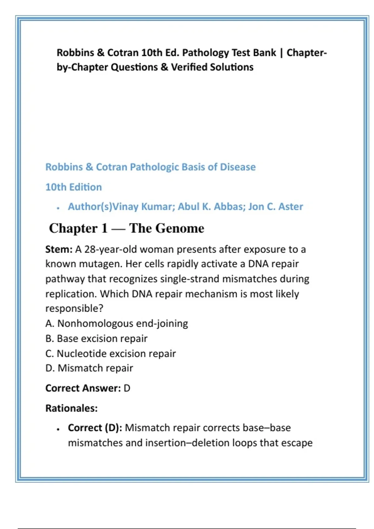 • Correct (D): Mismatch repair corrects base–base