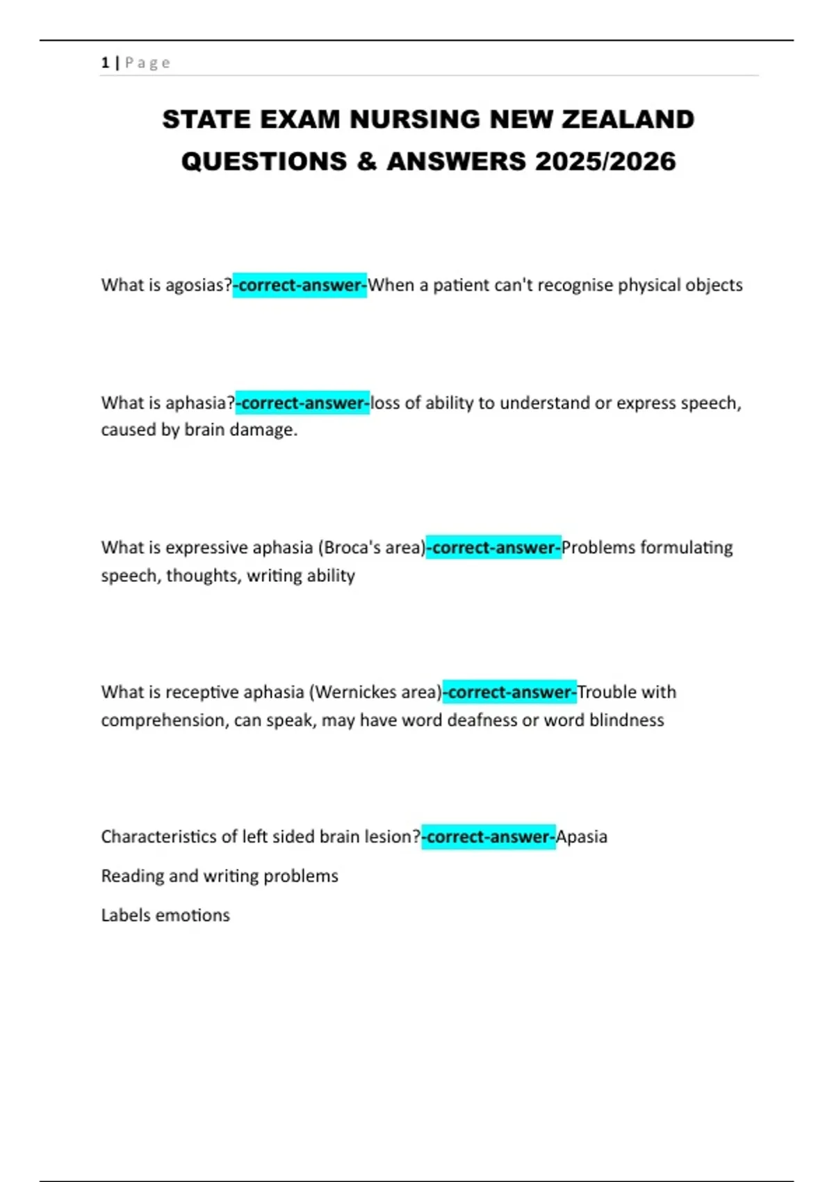 STATE EXAM NURSING NEW ZEALAND QUESTIONS & ANSWERS 2025/2026