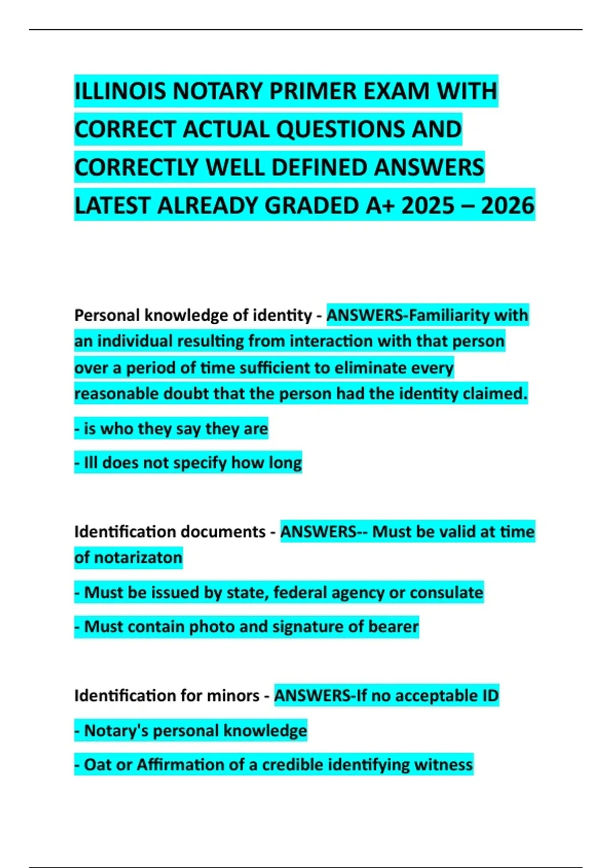 ILLINOIS NOTARY PRIMER EXAM WITH CORRECT ACTUAL QUESTIONS AND CORRECTLY WELL DEFINED ANSWERS LATEST ALREADY GRADED A+ 2025 – 2026