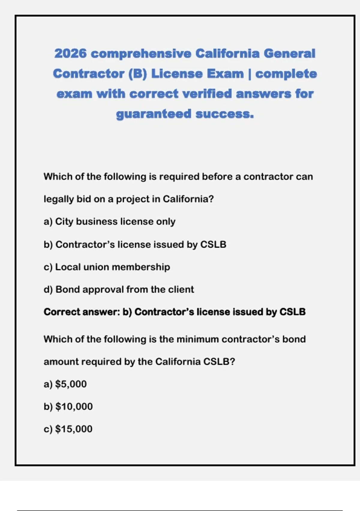 Correct answer: b) Contractor’s license issued by CSLB