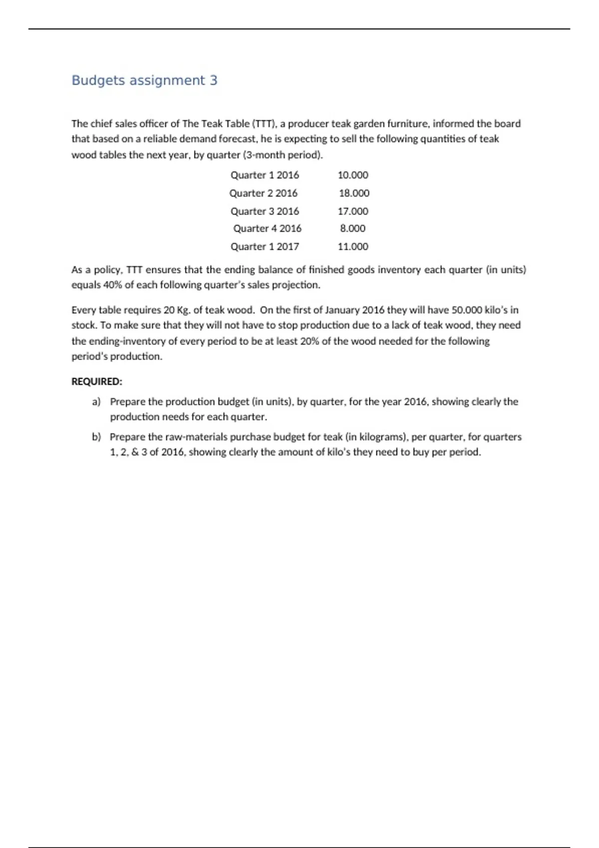 a) Prepare the production budget (in units), by quarter, for the year 2016, showing clearly the
