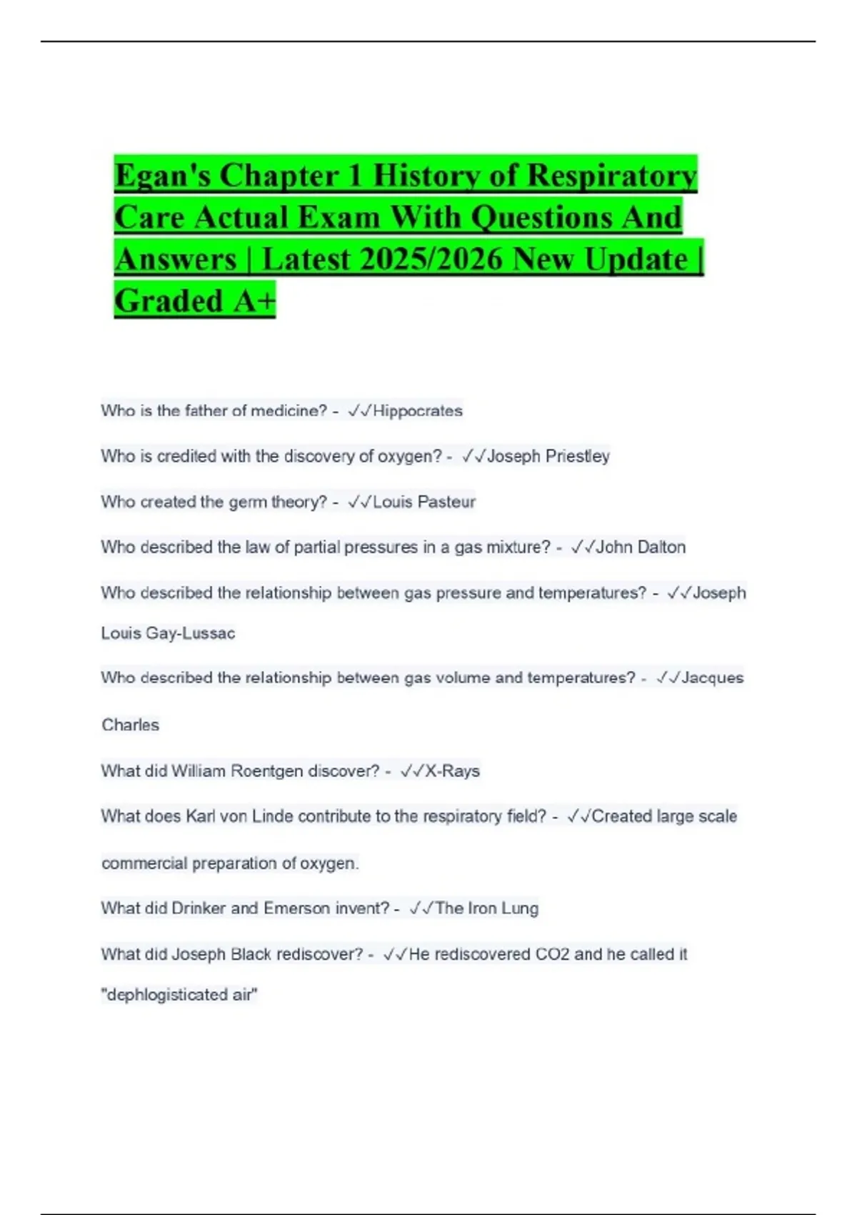 Egan's Chapter 1 History of Respiratory Care Actual Exam With Questions And Answers | Latest 2025/2026 New Update | Graded A+