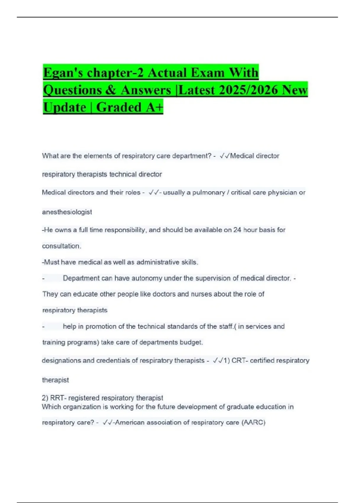 Egan's chapter-2 Actual Exam With Questions & Answers |Latest 2025/2026 New Update | Graded A+ What are the elements of respiratory care department? - Medical director respiratory therapists technical director Medical directors and their roles - - usually a pulmonary / critical care physician or anesthesiologist -He owns a full time responsibility, and should be available on 24 hour basis for consultation. -Must have medical as well as administrative skills. - Department can have autonomy under the supervision of medical director. - They can educate other people like doctors and nurses about the role of respiratory therapists - help in promotion of the technical standards of the staff.( in services and training programs) take care of departments budget. designations and credentials of respiratory therapists - 1) CRT- certified respiratory therapist 2) RRT- registered respiratory therapist Which organization is working for the future development of graduate education in respiratory care? - -American association of respiratory care (AARC)