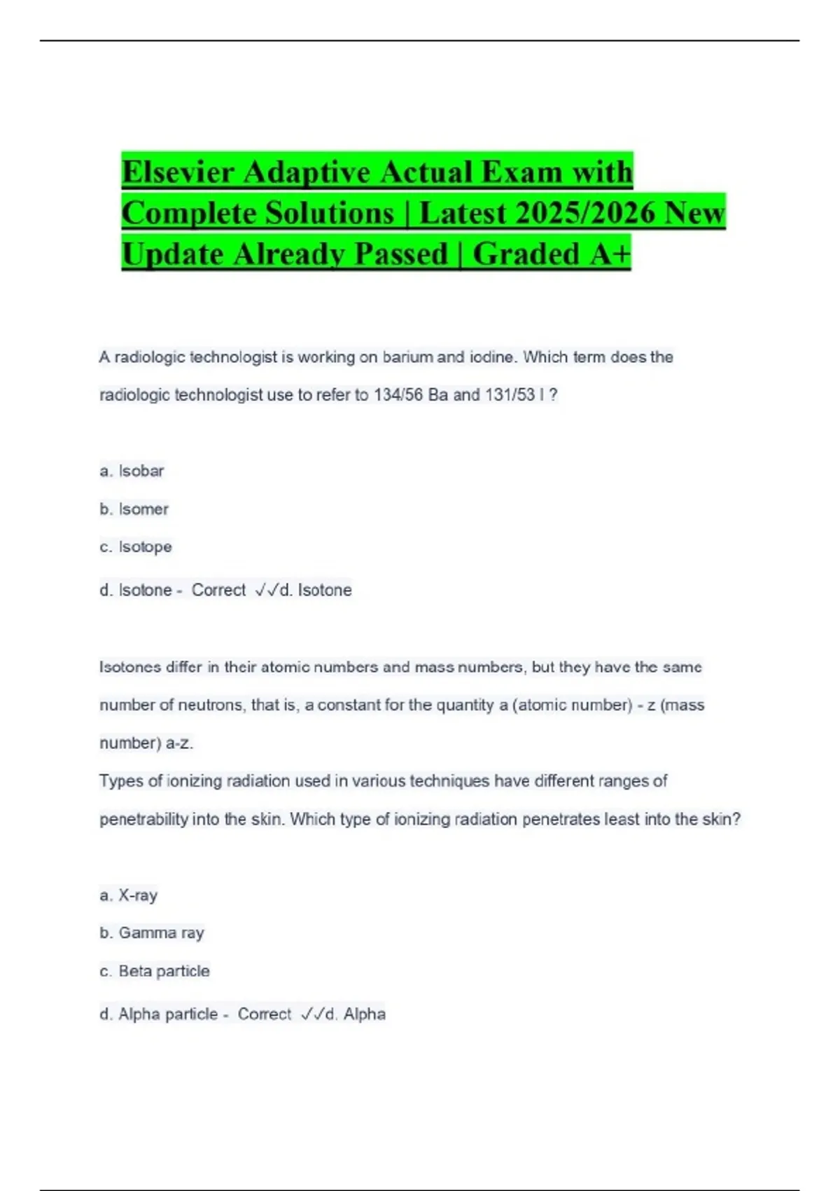 Elsevier Adaptive Actual Exam with Complete Solutions | Latest 2025/2026 New Update Already Passed | Graded A+ A radiologic technologist is working on barium and iodine. Which term does the radiologic technologist use to refer to 134/56 Ba and 131/53 I ? a. Isobar b. Isomer c. Isotope d. Isotone - Correct d. Isotone Isotones differ in their atomic numbers and mass numbers, but they have the same number of neutrons, that is, a constant for the quantity a (atomic number) - z (mass number) a-z. Types of ionizing radiation used in various techniques have different ranges of penetrability into the skin. Which type of ionizing radiation penetrates least into the skin? a. X-ray b. Gamma ray c. Beta particle d. Alpha particle - Correct d. Alpha