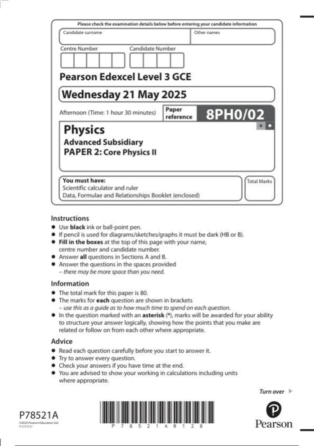 PEARSON EDEXCEL AS LEVEL PHYSICS PAPER 2 JUNE 2025 FINAL QUESTION PAPER