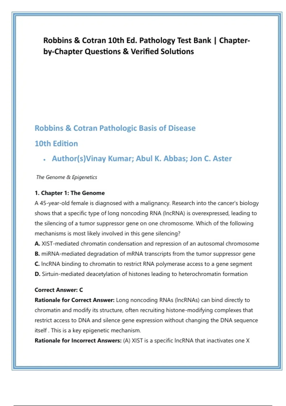 Robbins & Cotran Pathologic Basis of Disease 10th Edition Test Bank | 20 MCQs per Chapter with Verified Answers & Rationales Description Master the pathologic basis of disease and ace your exams with this complete test bank for Robbins & Cotran Pathologic Basis of Disease, 10th Edition. Meticulously aligned with the acclaimed textbook by Kumar, Abbas, and Aster, this resource is your ultimate tool for efficient and effective study. This comprehensive bank provides full chapter coverage, featuring 20 original, high-quality multiple-choice questions for each chapter. Every question includes the correct answer and a detailed, step-by-step rationale that explains both why the correct choice is right and why the distractors are wrong. This approach transforms simple memorization into deep conceptual understanding, helping you build the critical thinking skills essential for success on course exams, NCLEX, USMLE, and other board certifications. We've designed this test bank to boost your confidence and save you time. Use it to identify knowledge gaps, simulate exam conditions, and reinforce key pathology concepts through active recall. It's the perfect study partner for medical, nursing, and health sciences students who demand a proven edge. Invest in your future today and approach your exams with the mastery and confidence you deserve. Hashtags #RobbinsPathology #TestBank #MedicalExamPrep #NursingStudent #PathologyReview #USMLEPrep #NCLEXReview #MedSchool #MedicalEducation #StudyGuide Keywords Robbins and Cotran Pathologic Basis of Disease 10th Edition Robbins pathology test bank medical exam prep MCQ Kumar Abbas Aster test bank pathology review questions nursing pathophysiology study guide medical school test bank USMLE Step 1 pathology questions verified answer rationales