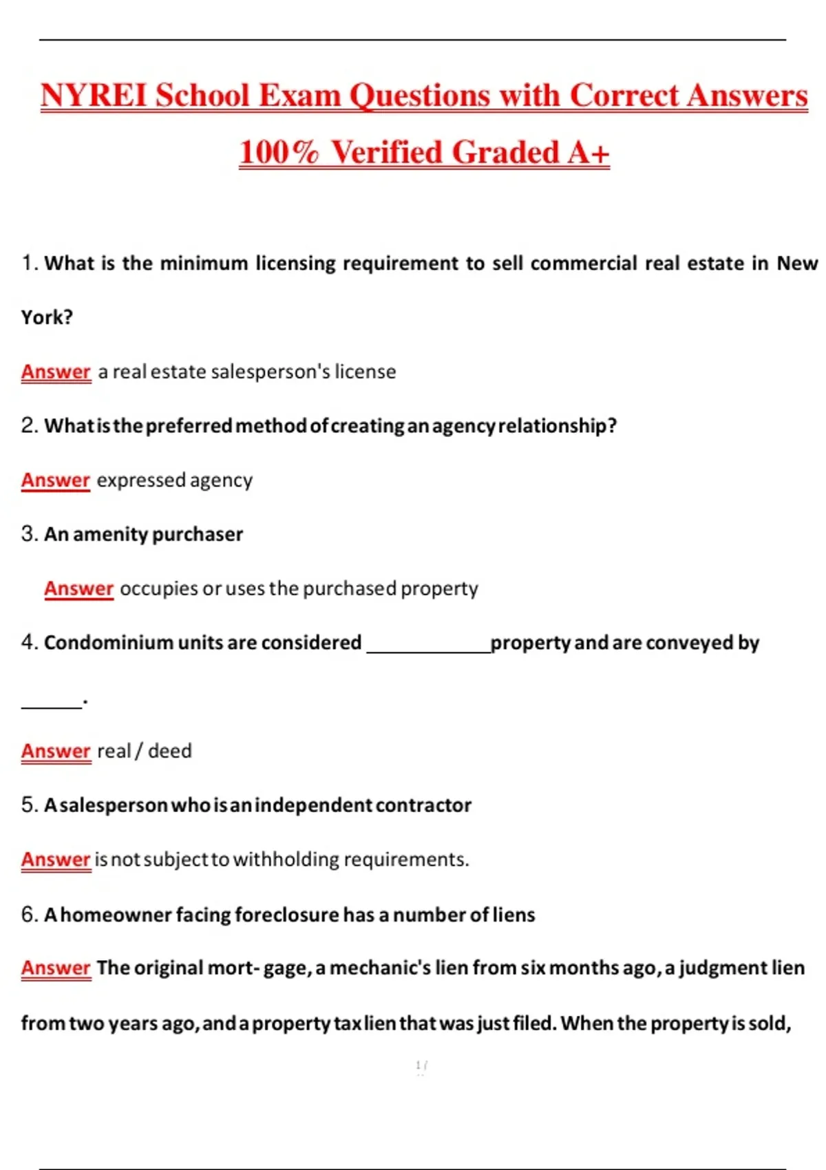 NYREI School Exam (Latest 2026/2027 Update) Complete Questions and Guide Answers, 100% Verified Graded A+ Prepare to ace your NYREI (New York Real Estate Institute) School Exam with this comprehensive 2026 edition of the Real Estate Salesperson and Broker Exam Study Guide — your ultimate resource for passing the New York real estate licensing exam on your first try. Developed by New York real estate educators and licensed instructors, this guide includes over 500 updated practice questions, detailed rationales, and NYREI-specific exam insights that mirror the actual school and state test formats. Whether you’re completing your real estate salesperson course or advancing to a broker license, this study tool ensures you master every key concept tested by the NY Department of State (DOS) and NYREI. This digital and printable exam prep material provides clear explanations, definitions, and practice scenarios covering law, finance, contracts, property ownership, and agency relationships — everything you need for NYREI’s course final and the NYS licensing exam. What’s Inside: 500+ realistic NYREI exam questions with correct answers Answer key with detailed rationales for better understanding Topic-by-topic coverage based on NYREI curriculum and NYS DOS content outline Updated 2026 law changes, ethics, and licensing requirements Covers Real Estate Principles, Finance, Agency, Contracts, Property Management Printable charts, definitions, and exam flashcards Includes both Salesperson & Broker level content Key Topics Covered: Real estate principles and practices in New York NY State Real Property Law & Licensing regulations Property ownership and land use controls Contracts, listings, and brokerage relationships Real estate finance, mortgages, and appraisals Ethics and professional conduct for real estate agents Environmental issues and fair housing laws Real estate mathematics and financial calculations NYREI course final exam preparation strategies DOS Licensing Exam application and testing procedures Perfect For: NYREI Real Estate School students New York Real Estate Salesperson exam candidates Broker licensing applicants Continuing education students preparing for final tests Real estate tutors and instructors teaching NY state licensing prep Anyone seeking NY real estate license success in 2026