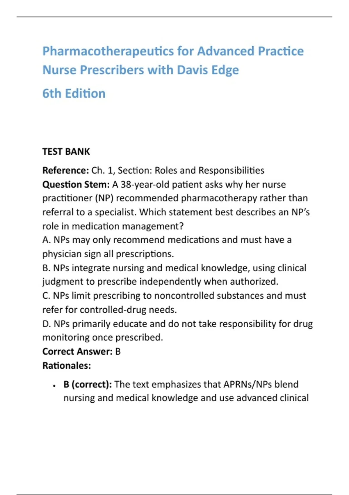 Pharmacotherapeutics for Advanced Practice Nurse Prescribers 6th Edition Test Bank with Answers & Rationales Ace your exams with the officially aligned test bank for Pharmacotherapeutics for Advanced Practice Nurse Prescribers with Davis Edge, 6th Edition by Teri Moser Woo and Wendy L. Wright. This comprehensive resource is carefully crafted to help advanced practice nursing students master pharmacology concepts and prepare with confidence for course exams, HESI, and NCLEX certification. Each chapter is fully covered with 20 multiple-choice questions (MCQs), designed in authentic NCLEX/HESI style. Every question includes the correct answer plus a step-by-step rationale, ensuring you don’t just memorize content but truly understand the “why” behind every choice. The test bank mirrors real-world exam expectations by focusing on prescribing principles, drug safety, patient education, therapeutic decision-making, and advanced clinical application. Rationales are verified against evidence-based practice, giving you peace of mind that your preparation is accurate and reliable. Perfect for students, instructors, and nurse practitioner candidates, this test bank offers a complete, chapter-by-chapter study solution that reinforces textbook learning while targeting exam success. Whether you’re aiming to strengthen classroom performance or achieve certification readiness, this test bank is your proven guide. Invest in your success today—study smarter, test with confidence, and step into practice fully prepared. Pharmacotherapeutics for Advanced Practice Nurse Prescribers 6th Edition test bank Teri Moser Woo test bank Wendy L. Wright pharmacotherapeutics Davis Edge pharmacology test bank Nursing pharmacology exam prep NCLEX RN test bank with rationales Nurse practitioner prescribing study guide HESI style nursing questions Advanced practice nursing pharmacology review Nursing test bank answers and explanations #NursingSchool #NCLEXPrep #NursePractitioner #StudyWithMe #PharmacologyMadeEasy #NursingExamSuccess #TestBankAnswers #HESIPrep #FutureNurse #NursingStudentLife