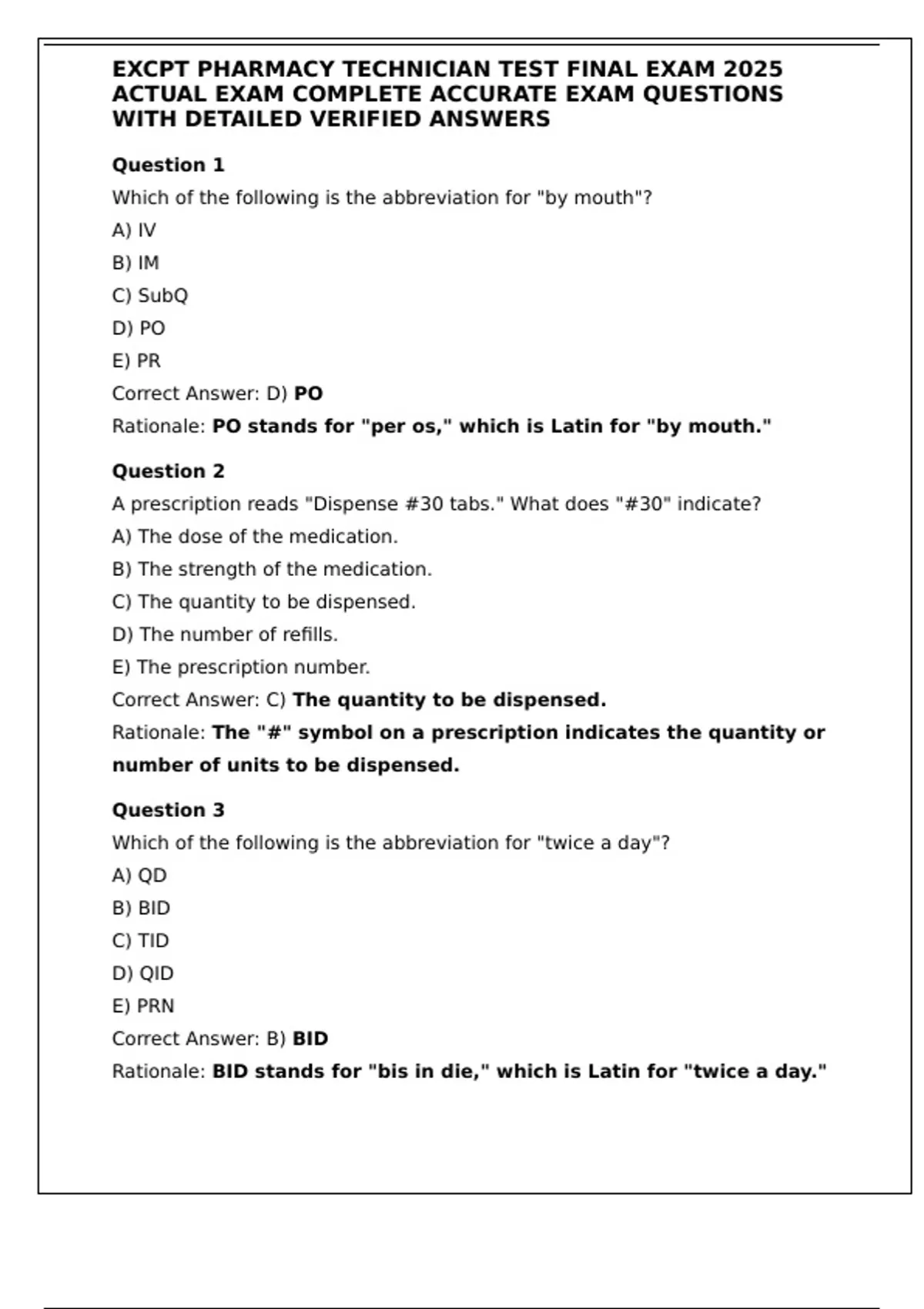 EXCPT PHARMACY TECHNICIAN TEST FINAL EXAM 2025 ACTUAL EXAM COMPLETE ACCURATE EXAM QUESTIONS WITH DETAILED VERIFIED ANSWERS