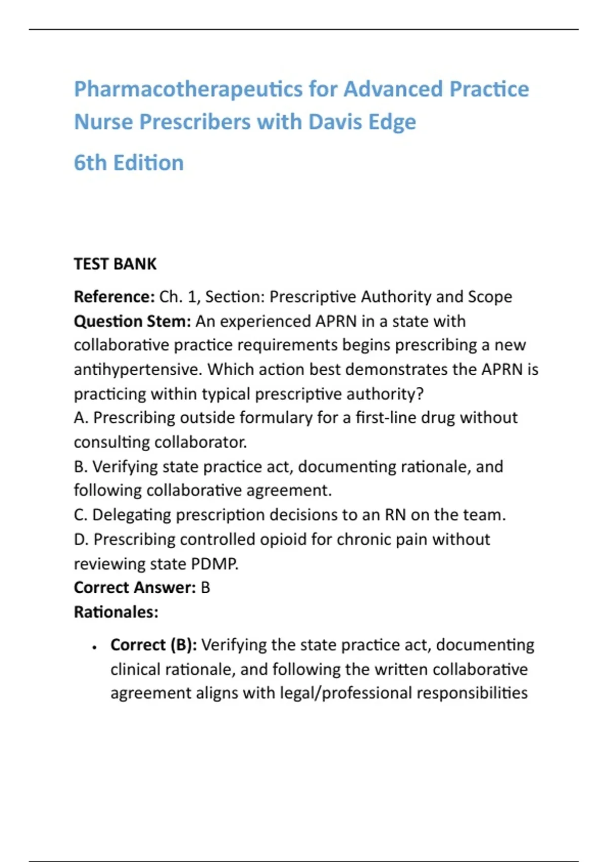 Pharmacotherapeutics for Advanced Practice Nurse Prescribers 6th Edition Test Bank with Answers & Rationales Master pharmacology with confidence using this complete test bank for Pharmacotherapeutics for Advanced Practice Nurse Prescribers with Davis Edge, 6th Edition by Teri Moser Woo and Wendy L. Wright. Designed specifically for advanced practice nursing students and educators, this resource provides comprehensive coverage of every chapter to strengthen your prescribing knowledge and clinical decision-making skills. Inside, you’ll find 20 carefully written multiple-choice questions (MCQs) per chapter, each with the correct answer and detailed, step-by-step rationale. Every question is aligned with the textbook and reflects real-world prescribing challenges, making it ideal for APRN coursework, HESI exams, and NCLEX-style review. This test bank doesn’t just give you the right answers—it helps you understand why. Rationales are clear, evidence-based, and verified to build critical thinking skills while reinforcing pharmacology concepts. Whether you’re preparing for certification, strengthening classroom performance, or teaching future nurse practitioners, this resource is built to support exam success and safe prescribing practice. With its chapter-by-chapter structure, verified rationales, and exam-focused design, this test bank saves time, boosts confidence, and improves outcomes for nursing students at every level. Get the competitive edge you need—study smarter, practice effectively, and succeed with this trusted pharmacology test bank. Pharmacotherapeutics for Advanced Practice Nurse Prescribers 6th Edition Woo and Wright pharmacology test bank Pharmacotherapeutics Davis Edge test bank Nursing pharmacology exam prep APRN prescribing study guide NCLEX pharmacology review questions Nurse practitioner test bank with rationales Advanced practice nursing exam prep Verified nursing test bank answers HESI and certification pharmacology review #NursingStudents #NursePractitioner #NCLEXPrep #PharmacologyMadeEasy #AdvancedPracticeNursing #ExamSuccess #StudyWithMeNursing #NursingSchoolHelp #HESIReview #TestBankForNursing