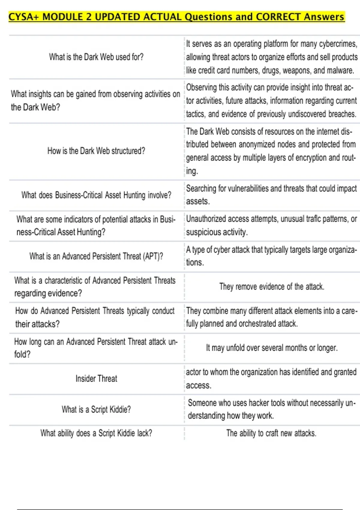 CYSA+ MODULE 2 UPDATED ACTUAL Questions and CORRECT Answers