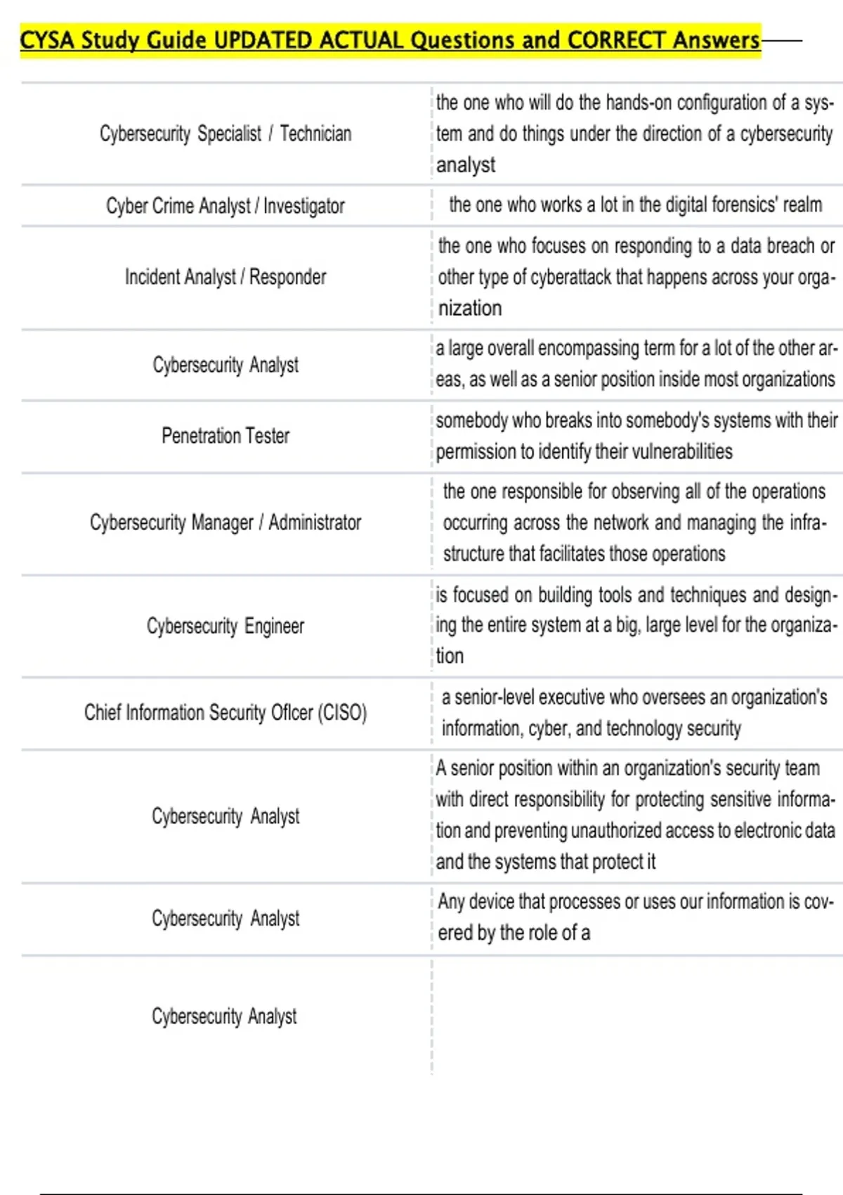 CYSA Study Guide UPDATED ACTUAL Questions and CORRECT Answers