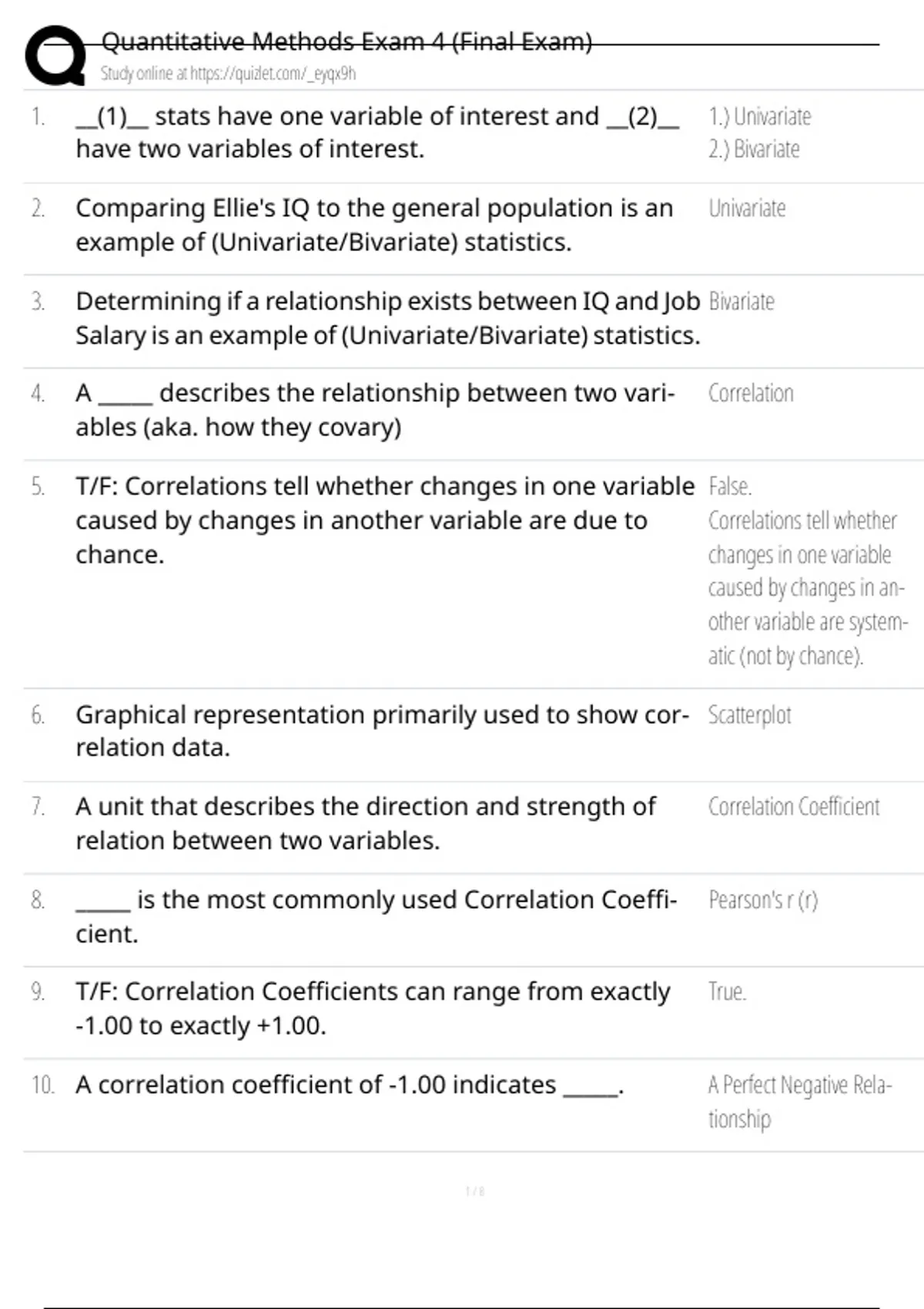 9. T/F: Correlation Coefficients can range from exactly True.