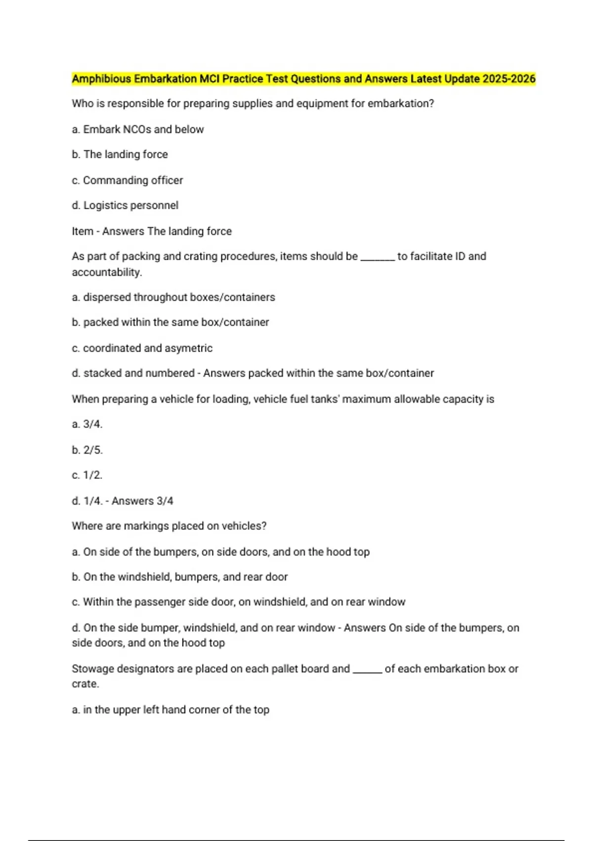 Amphibious Embarkation MCI Practice Test Questions and Answers Latest Update Who is responsible for preparing supplies and equipment for embarkation? a. Embark NCOs and below b. The landing force c. Commanding officer d. Logistics personnel Item - Answers The landing force As part of packing and crating procedures, items should be _______ to facilitate ID and accountability. a. dispersed throughout boxes/containers b. packed within the same box/container c. coordinated and asymetric d. stacked and numbered - Answers packed within the same box/container When preparing a vehicle for loading, vehicle fuel tanks' maximum allowable capacity is a. 3/4. b. 2/5. c. 1/2. d. 1/4. - Answers 3/4 Where are markings placed on vehicles? a. On side of the bumpers, on side doors, and on the hood top b. On the windshield, bumpers, and rear door c. Within the passenger side door, on windshield, and on rear window d. On the side bumper, windshield, and on rear window - Answers On side of the bumpers, on side doors, and on the hood top Stowage designators are placed on each pallet board and ______ of each embarkation box or crate. a. in the upper left hand corner of the top b. on the backside c. on the upper right hand corner d. in the center - Answers in the upper left hand corner of the top UP&TT numbers categorizes containers by _____ or _____ requirements. a. storage/compartment b. cargo/hold c. stowage/handling d. size/weight - Answers stowage/handling Name the two designated embarkation areas. a. Parking area and loading area b. Staging area and the embarkation point c. Loading point and staging area d. Marshalling area and embarkation point Item - Answers Marshalling area and embarkation point Item A preliminary survey of the embarkation area is preformed by the _________officer. a. team embarkation b. logistics c. commanding d. ship's deck Item - Answers team embarkation Considerations, __________, and personnel are the three principles for movement to the embarkation. a. availability b. space c. cargo d. cost - Answers cargo The two areas for staging cargo and equipment are ______ assembly area and _____ assembly area. a. cargo/equipment b. equipment/transportation c. supplies/vehicle d. cargo/vehicle - Answers cargo/vehicle A load plan is a a. document used to incorporate all cargo, vehicles, and equipment authorized to be loaded. b. document indicating which loads will be moved. c. documented statement moving supplies and equipment. d. plan to move and load equipment from one area to another. - Answers document used to incorporate all cargo, vehicles, and equipment authorized to be loaded. The general types of loading in amphibious operations are _____ loading and ______ loading. a. administrative/combat b. horizontal/vertical c. vertical/combat d. spread/organizational Item - Answers administrative/combat What are the different methods of loading? a. Combat unit loading, combat organizational loading, and combat spread loading b. Unit loading, combat layout loading, and thread loading c. Spread loading, organized loading, and administrative loading d. Vertical loading, horizontal loading, and combat spread loading - Answers Combat unit loading, combat organizational loading, and combat spread loading Which type of cargo handling gear is best for moving pallets, containers, or heavy boxes on a pier and aboard ship? a. Lifting slings and spreader bars b. Cargo nets and slings c. Forklift or fingerlift d. Tractors and trailers - Answers Forklift or fingerlift Which method of stowing is used to facilitate rapid offload at the destination with the least possible disturbance of cargo intended for other points? a. Horizontal b. Vertical c. Block d. Organizational - Answers Block What are two of the three separate control groups that perform ship-to-shore movement? a. TAC4 and NAVTAC b. NAVTAC and LOGTAC c. TACLOG and TACGRU