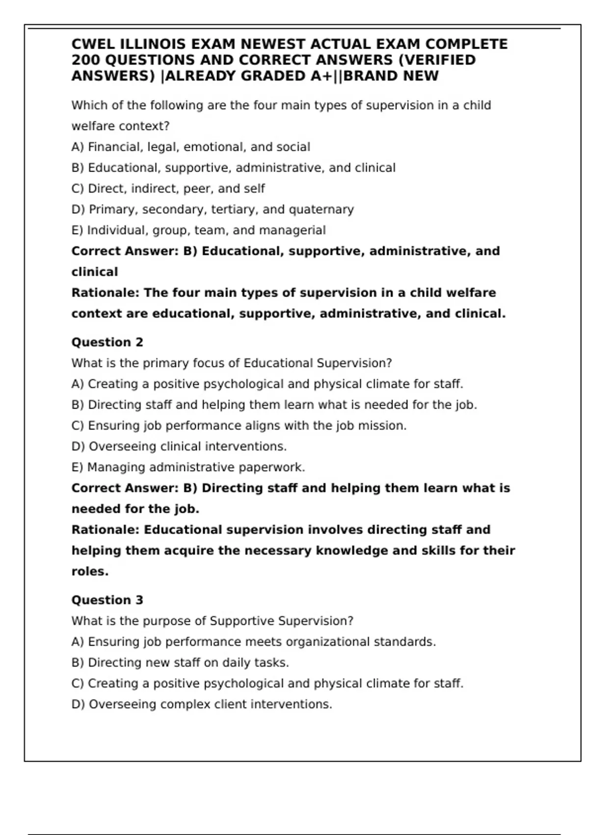 Get the CWELL Illinois Exam – Newest Complete Version (2025) with 200 real exam questions and verified correct answers. Already graded A+, this study resource is designed to help you pass with confidence. Covers child welfare supervision, permanency planning, DCFS mission, cultural competence, consent decrees, case reviews, family team meetings, and more. Includes detailed rationales for every question to strengthen your understanding and ensure exam success. Perfect for Illinois CWELL exam prep, child welfare professionals, and students in social work or child protection training.