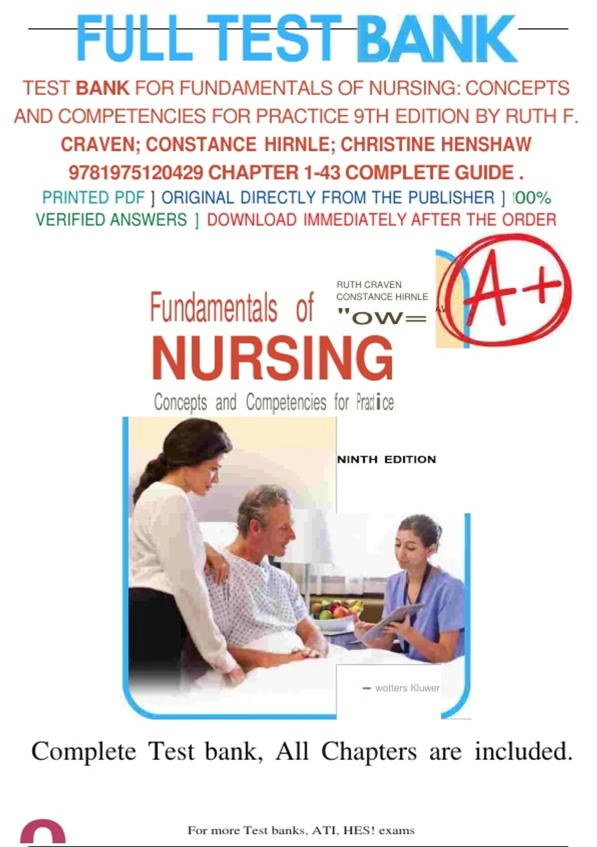 This document contains the complete test bank for Fundamentals of Nursing: Concepts and Competencies for Practice (9th Edition) by Craven, Hirnle, and Henshaw. It includes multiple-choice questions, true/false items, multiple-response, and matching exercises with correct answers. The content covers all 43 chapters of the textbook, including professional roles in nursing, ethics and legal issues, evidence-based practice, nursing process, health promotion, patient safety, medication administration, infection control, perioperative nursing, wound care, pain management, fluid and electrolyte balance, and psychosocial aspects of care. This comprehensive resource is fully aligned with the textbook and ideal for exam preparation and NCLEX-style practice.