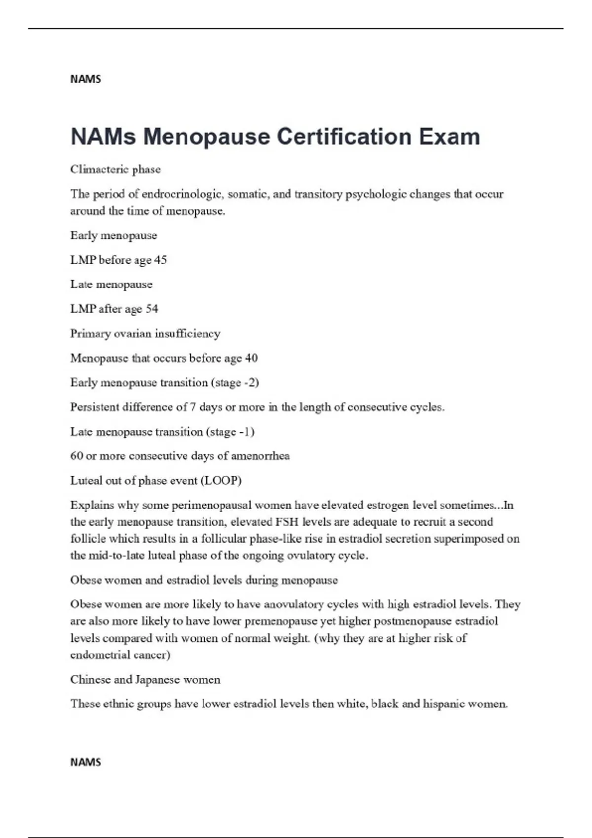 Climacteric phase The period of endrocrinologic, somatic, and transitory psychologic changes that occur around the time of menopause. Early menopause LMP before age 45 Late menopause LMP after age 54 Primary ovarian insufficiency Menopause that occurs before age 40 Early menopause transition (stage -2) Persistent difference of 7 days or more in the length of consecutive cycles. Late menopause transition (stage -1) 60 or more consecutive days of amenorrhea Luteal out of phase event (LOOP) Explains why some perimenopausal women have elevated estrogen level sometimes...In the early menopause transition, elevated FSH levels are adequate to recruit a second follicle which results in a follicular phase-like rise in estradiol secretion superimposed on the mid-to-late luteal phase of the ongoing ovulatory cycle. Obese women and estradiol levels during menopause Obese women are more likely to have anovulatory cycles with high estradiol levels. They are also more likely to have lower premenopause yet higher postmenopause estradiol levels compared with women of normal weight. (why they are at higher risk of endometrial cancer) Chinese and Japanese women These ethnic groups have lower estradiol levels then white, black and hispanic women.