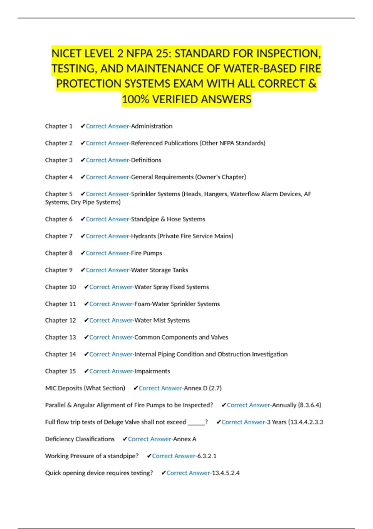 NICET LEVEL 2 NFPA 25: STANDARD FOR INSPECTION, TESTING, AND MAINTENANCE OF WATER-BASED FIRE PROTECTION SYSTEMS EXAM WITH ALL CORRECT & 100% VERIFIED ANSWERS