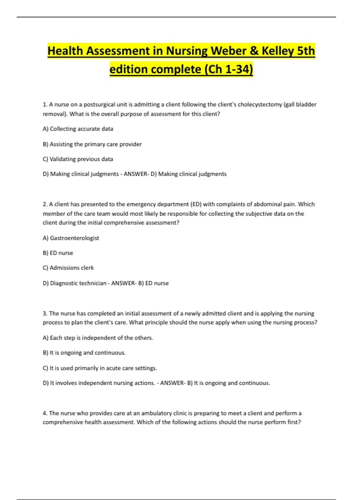 This comprehensive resource spans all 34 chapters of Health Assessment in Nursing by Weber & Kelley (5th Edition), offering an in-depth exploration of physical and psychosocial evaluation techniques essential for nursing practice. Covering foundational concepts, body system assessments, and specialized populations, the document supports nursing students and educators with structured guidance on clinical reasoning, patient communication, and diagnostic procedures. Ideal for academic review, curriculum planning, or exam preparation.