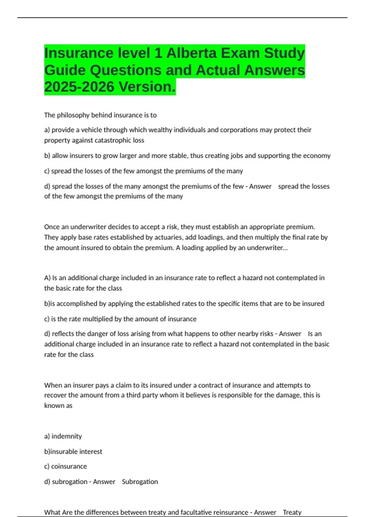 Insurance level 1 Alberta Exam Study Guide Questions and Actual Answers Version.