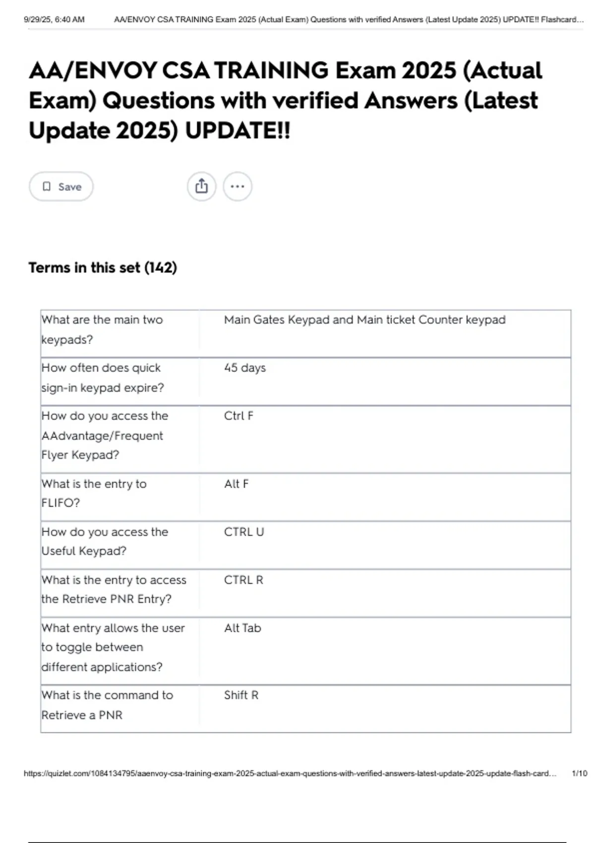 9/29/25, 6:40 AM AA/ENVOY CSA TRAINING Exam 2025 (Actual Exam) Questions with verified Answers (Latest Update 2025) UPDATE!! Flashcard…
