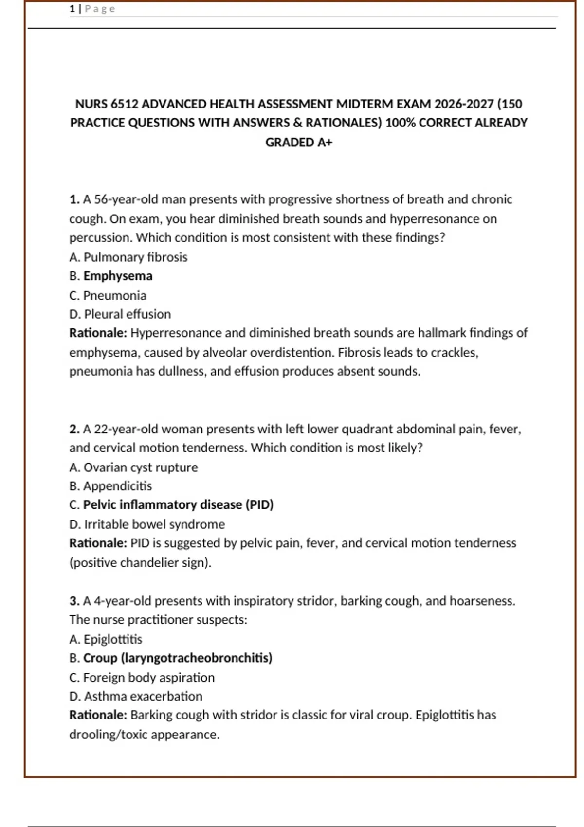 Prepare confidently with the NURS 6512 Advanced Health Assessment Midterm Exam 2026 study guide. This resource includes 150 detailed practice questions with correct answers and rationales to strengthen your clinical reasoning and exam readiness. Covering advanced health assessment techniques, diagnostic reasoning, and case-based scenarios, these questions are designed for graduate-level nursing students. Whether you are reviewing physical exam skills, patient history analysis, or differential diagnoses, this midterm prep set helps you master core concepts. Use it as a self-assessment tool or as supplemental study material to ensure success in your NURS 6512 midterm and beyond.