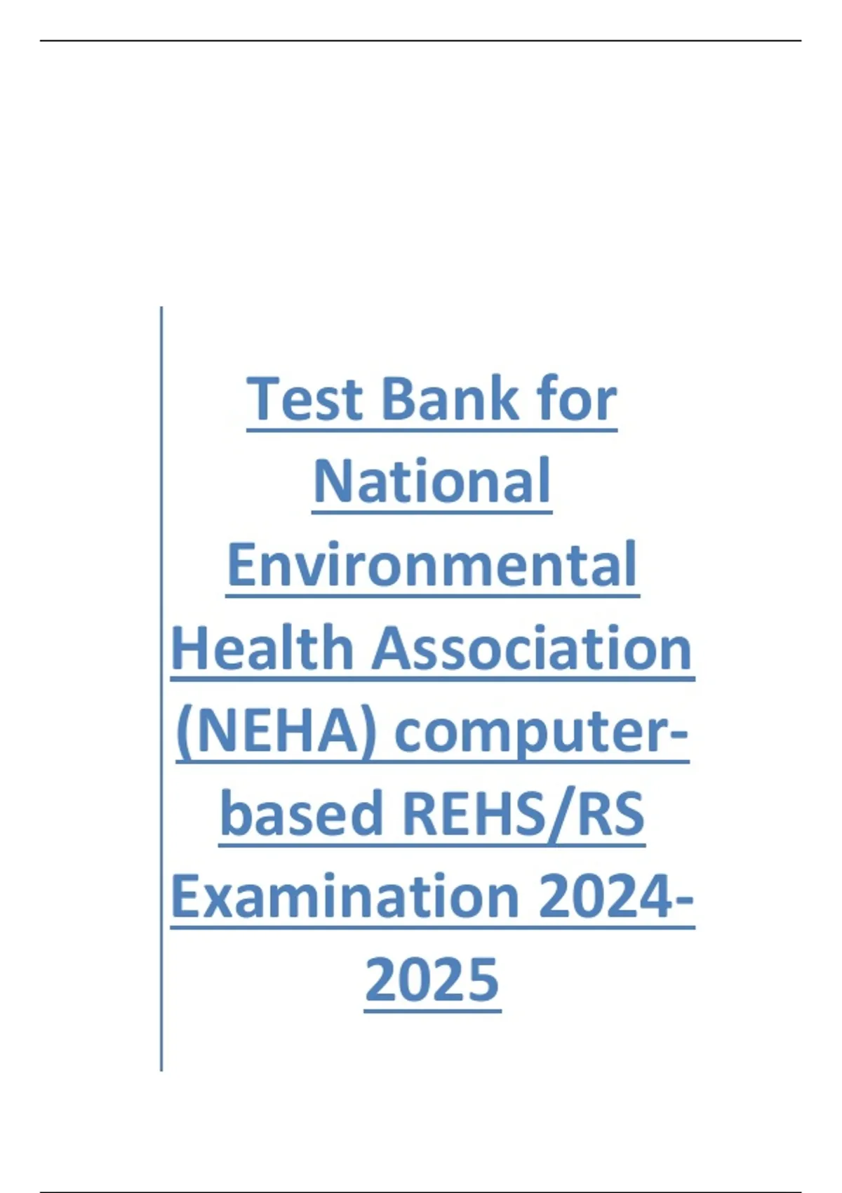 This comprehensive test bank is your ultimate preparation tool for the NEHA Registered Environmental Health Specialist/Registered Sanitarian (REHS/RS) computer-based examination for 2024–2025. Designed to mirror the structure and rigor of the official NEHA exam, this resource includes a wide range of practice questions that cover all critical domains of environmental health—from food safety and water quality to waste management, vector control, and disaster preparedness. Whether you're a student, public health professional, or aspiring health inspector, this test bank provides the depth and breadth needed to master the material and boost your confidence. With instant download access, you can begin studying immediately and efficiently. This is an ideal resource for self-study, classroom instruction, or professional review, offering a reliable and thorough way to prepare for certification. Don't miss your chance to study smarter and pass with confidence.