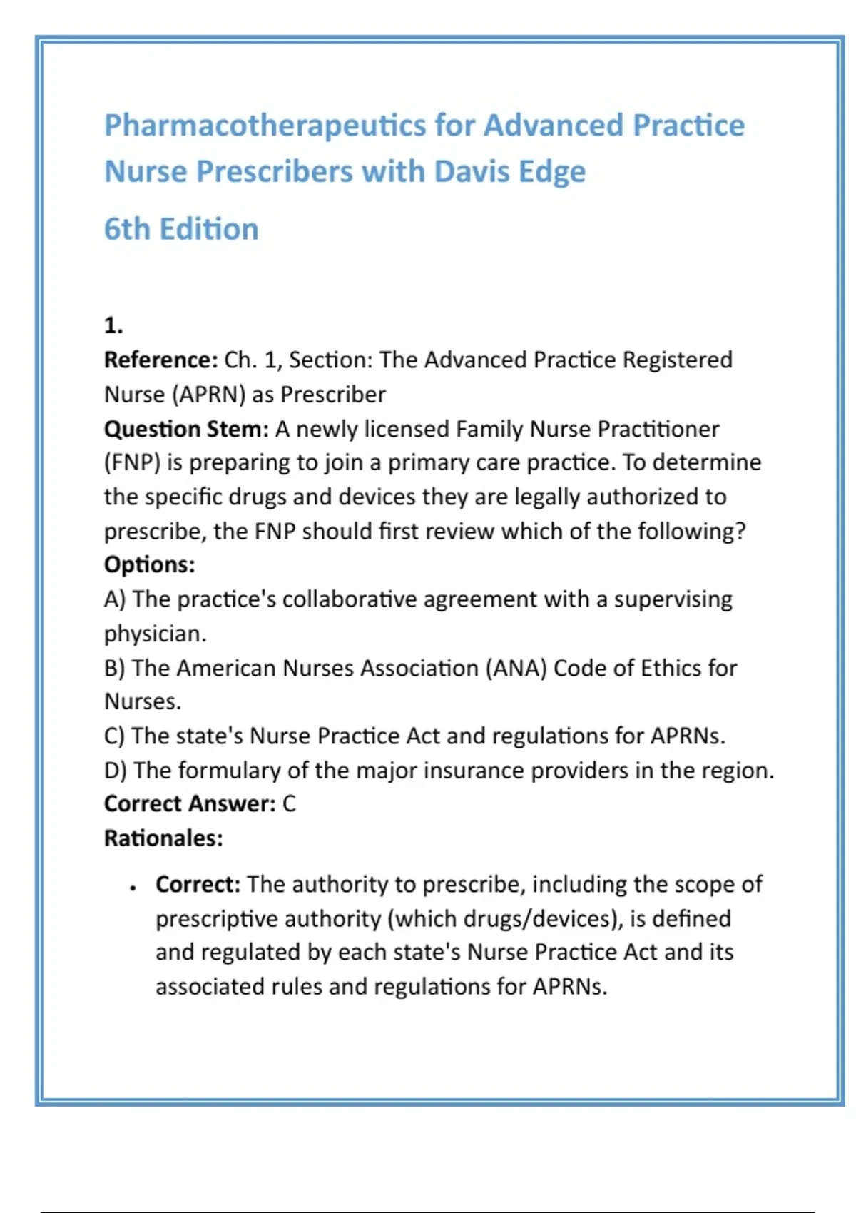 Pharmacotherapeutics for Advanced Practice Nurse Prescribers 6th Edition Test Bank: Answers & Rationales 2. Description Ace your advanced pharmacology exams and build the confidence you need for safe prescribing with this complete test bank for Pharmacotherapeutics for Advanced Practice Nurse Prescribers with Davis Edge, 6th Edition by Teri Moser Woo and Wendy L. Wright. This indispensable resource is meticulously crafted to align with your textbook and the latest AACN/NONPF criteria, ensuring you are studying the most relevant and up-to-date material. It provides full coverage of every chapter, giving you a comprehensive review tool that leaves no topic behind. Inside, you'll find 20 original, high-quality multiple-choice questions (MCQs) per chapter, mirroring the complexity and focus of your certification exams. Each question comes with a verified correct answer and a step-by-step rationale that does more than just state the fact—it explains the why behind the answer. This deep, conceptual understanding helps you master pharmacologic principles and apply them to clinical practice, moving beyond simple memorization. Whether you are preparing for a midterm, final, or your NP board certification, this test bank is designed to optimize your study time. Use it to identify your strengths and weaknesses, simulate exam conditions, and ultimately ensure you are ready to excel. Empower your journey to becoming a safe, effective, and advanced practice nurse prescriber. Key Features: Full coverage of all textbook chapters 20 MCQs per chapter with verified answers In-depth, step-by-step rationales for deeper learning Aligned with certification exams and the 6th edition textbook The ultimate tool for exam success and clinical confidence 3. Keywords Pharmacotherapeutics Advanced Practice Nurse Prescribers Woo Wright 6th Edition Nurse Practitioner Test Bank Advanced Pharmacology MCQ NP Board Exam Prep Davis Edge Pharmacology Nursing Prescriber Study Guide NCLEX Review Advanced 4. Hashtags #NursePractitioner #NPStudent #NCLEXReview #Pharmacology #NursingSchool #TestBank #NursingExam #MedEd #NurseLife #AdvancedPracticeNurse