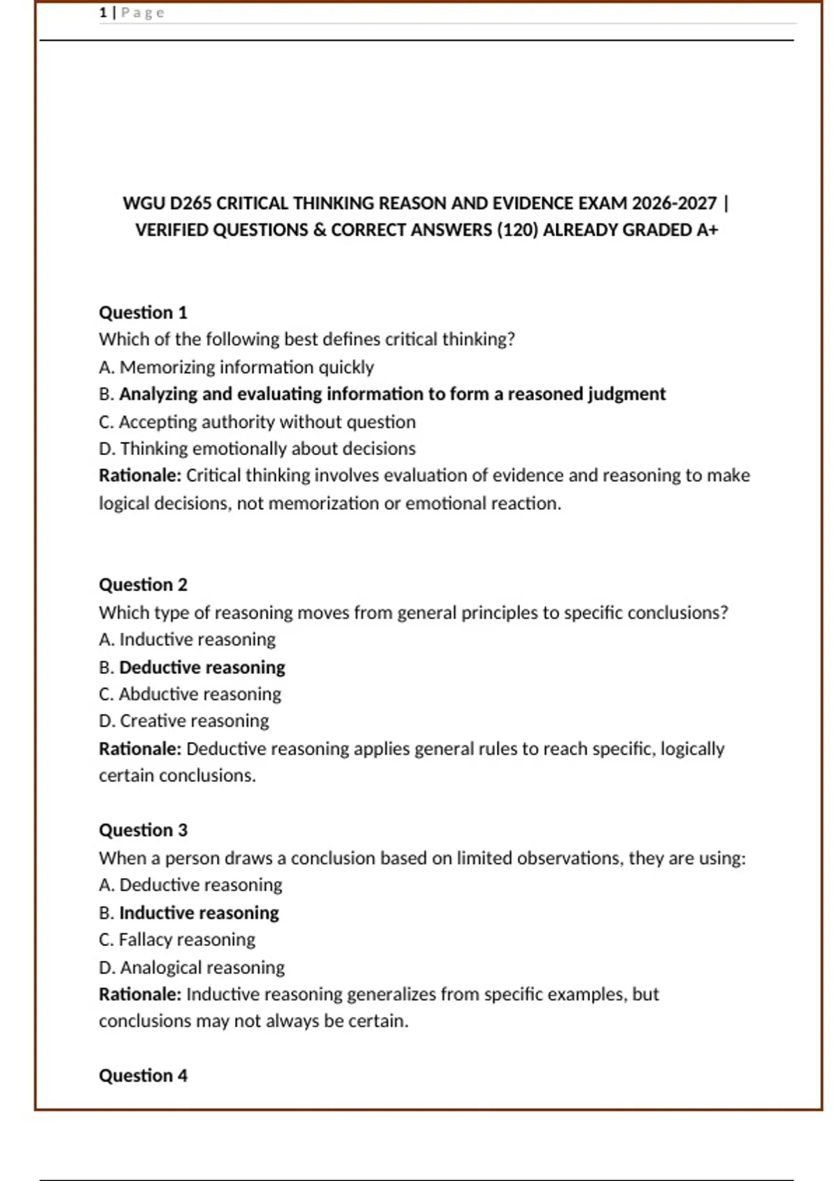Prepare with confidence using the WGU D265 Critical Thinking: Reason and Evidence Objective Assessment Exam 2026 complete test bank. This study resource provides 120 verified exam questions with correct answers and rationales, covering key concepts such as inductive and deductive reasoning, logical fallacies, argument evaluation, evidence credibility, and policy/value/fact claims. Designed to mirror the latest WGU assessment format, these practice questions strengthen analytical skills and critical reasoning strategies needed for academic success. Whether you’re reviewing for the midterm or final objective exam, this updated guide ensures thorough preparation and maximizes your chances of achieving a passing score.