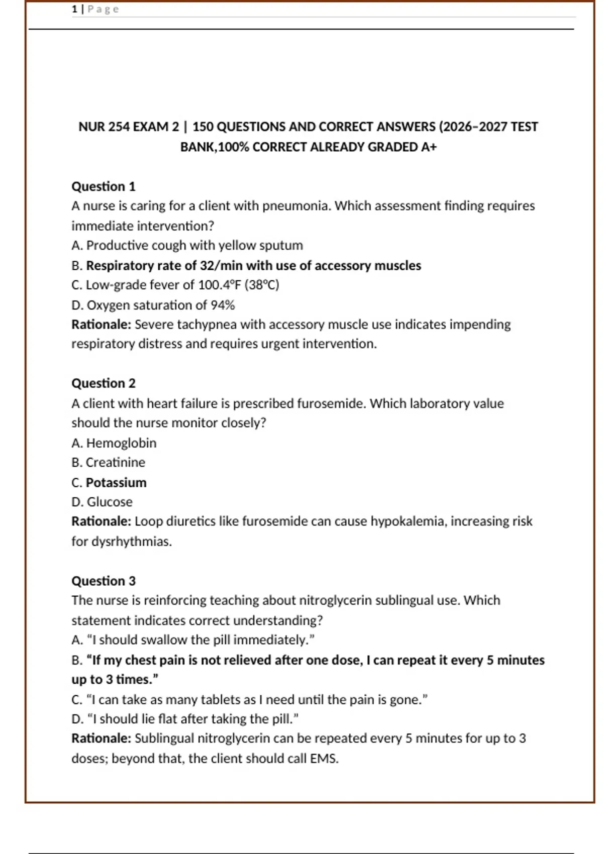 NUR 254 EXAM 2 | 150 QUESTIONS AND CORRECT ANSWERS (2026–2027 TEST