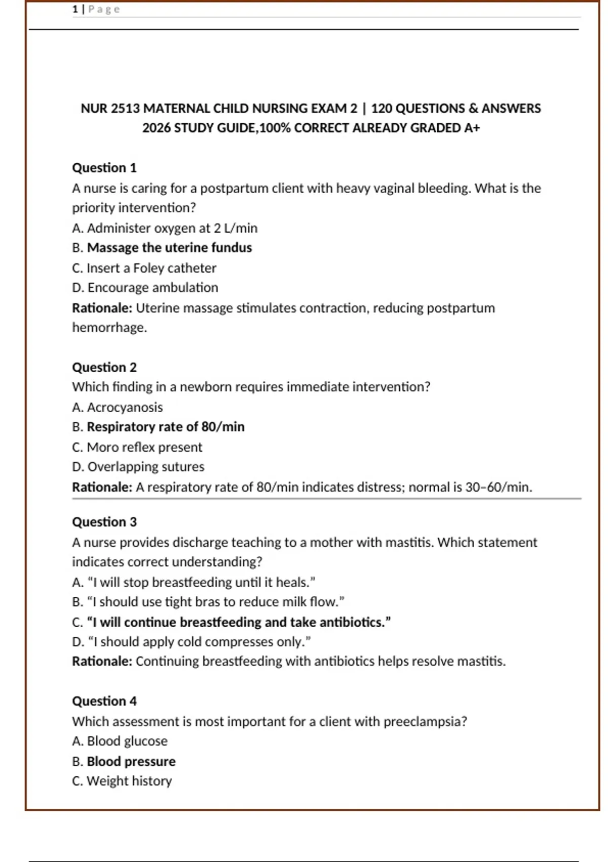 NUR 2513 MATERNAL CHILD NURSING EXAM 2 | 120 QUESTIONS & ANSWERS