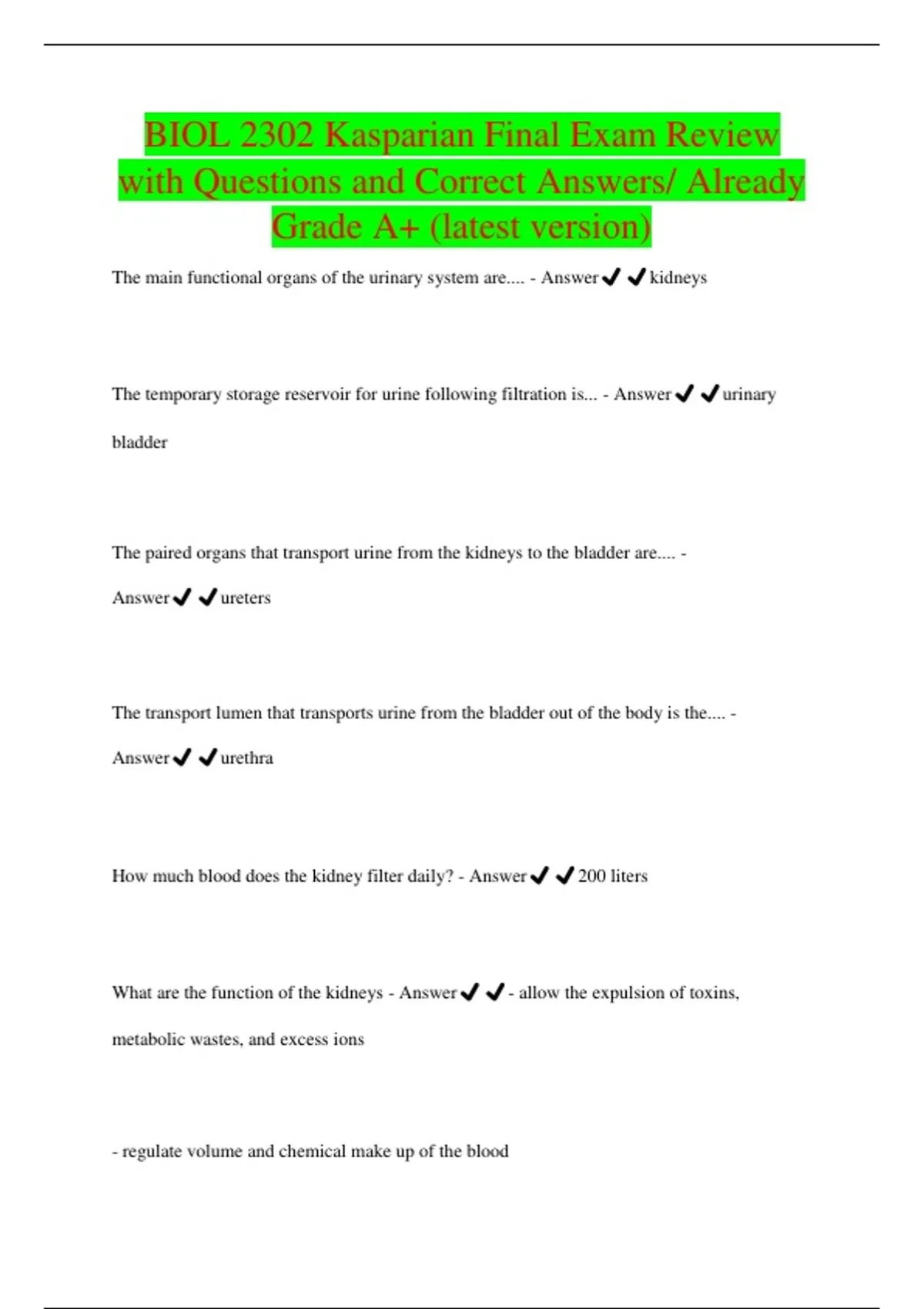 BIOL 2302 Kasparian Final Exam Review with Questions and Correct Answers/ Already Grade A+ (latest version)