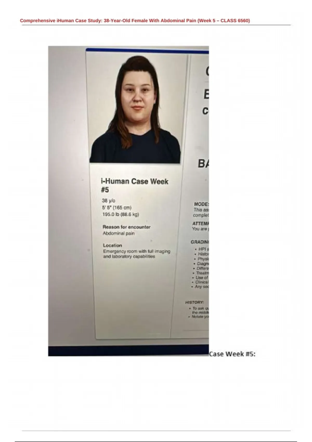 Explore a comprehensive iHuman case analysis of a 38-year-old female presenting with abdominal pain. Includes clinical reasoning, differential diagnosis, and treatment options. (Week 5 – CLASS 6560) . This comprehensive iHuman case study explores the clinical assessment, differential diagnosis, and management of abdominal pain in a 38-year-old female patient. Designed for Week 5 of CLASS 6560, the analysis includes detailed history-taking, focused physical examination, interpretation of diagnostic tests (labs and imaging), and evidence-based treatment planning. Ideal for nursing, NP, PA, and medical students seeking to enhance clinical reasoning, diagnostic skills, and decision-making through virtual patient simulation.