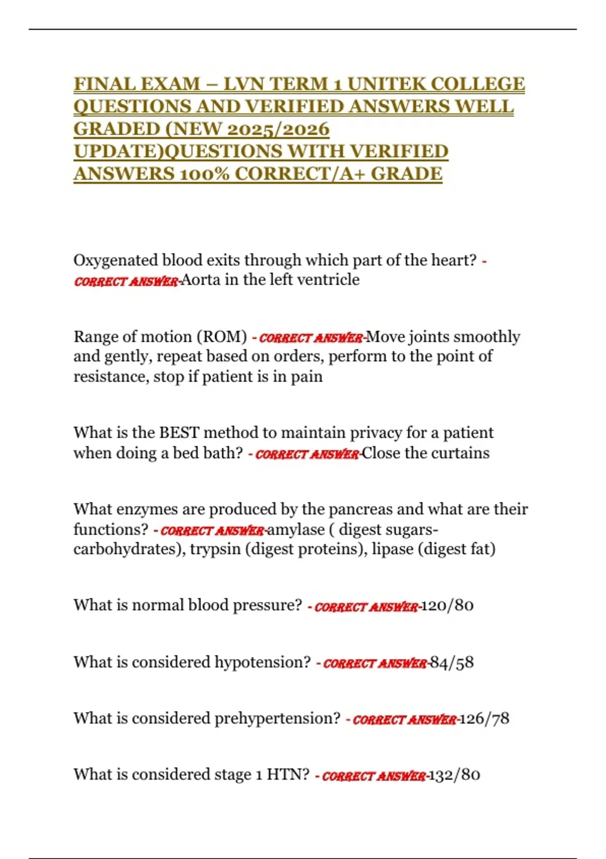 FINAL EXAM – LVN TERM 1 UNITEK COLLEGE QUESTIONS AND VERIFIED ANSWERS WELL GRADED (NEW 2025/2026 UPDATE)QUESTIONS WITH VERIFIED ANSWERS 100% CORRECT/A+ GRADEFINAL EXAM – LVN TERM 1 UNITEK COLLEGE QUESTIONS AND VERIFIED ANSWERS WELL GRADED (NEW 2025/2026 U