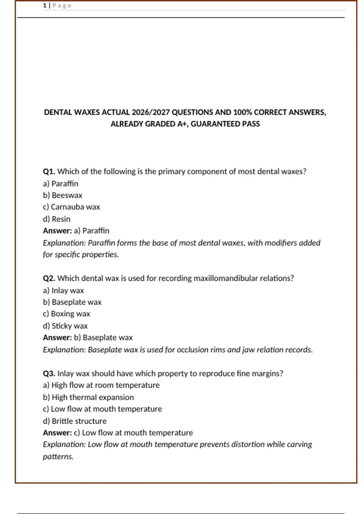 DENTAL WAXES ACTUAL 2026/2027 QUESTIONS AND 100% CORRECT ANSWERS,