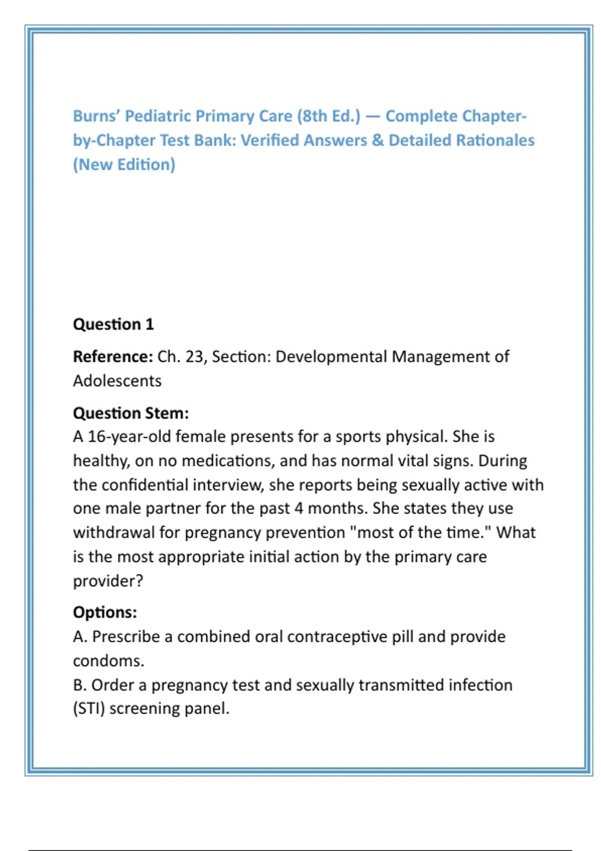 Burns' Pediatric Primary Care 8th Edition Test Bank | NCLEX & HESI Prep Complete Test Bank for Burns' Pediatric Primary Care 8th Edition | All Chapters SEO-Friendly Description Ace your exams and master pediatric primary care with the complete test bank for Burns' Pediatric Primary Care, 8th Edition. This essential resource is meticulously aligned with the textbook by Garzon, Dirks, Driessnack, Duderstadt, and Gaylord, providing a comprehensive review for nursing students, educators, and certification candidates . Our test bank offers full coverage of all chapters, featuring 20 multiple-choice questions (MCQs) per chapter designed to mirror the rigor of NCLEX, HESI, and board certification exams . Each question comes with a verified correct answer and a detailed, step-by-step rationale that reinforces key clinical concepts and evidence-based practice guidelines . This is more than just an answer key; it's a powerful study tool that builds critical thinking and diagnostic reasoning skills for pediatric primary care settings . For instructors, this test bank is a ready-made resource for creating quizzes and exams. For students, it's the ultimate prep tool for guaranteed success in your coursework and on certification day. Get the confidence you need to pass—download your copy now! High-Impact Keywords Pediatric Primary Care Test Bank Burns Pediatric Primary Care 8th Edition NCLEX Pediatric Questions HESI Exam Prep Nurse Practitioner Board Review Pediatrics Test Bank Nursing Exam Questions Garzon Dirks Driessnack #️⃣ SEO-Driven Hashtags #BurnsPediatricPrimaryCare #TestBank #NursingExamPrep #NCLEX2025 #HESIExam #NursePractitioner #PediatricNursing #MedicalTestBank #GuaranteedPass #StuviaTopSeller