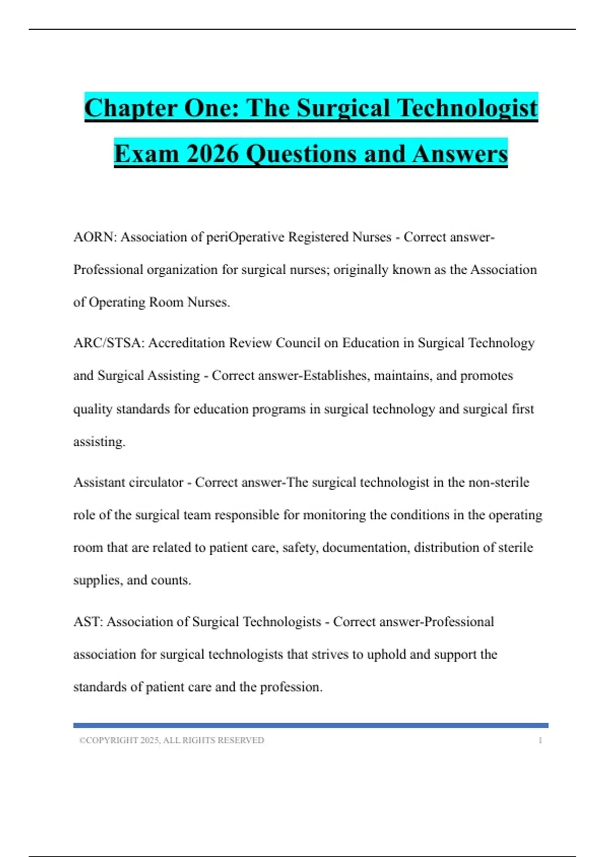 Chapter One: The Surgical Technologist Exam 2026 Questions and Answers